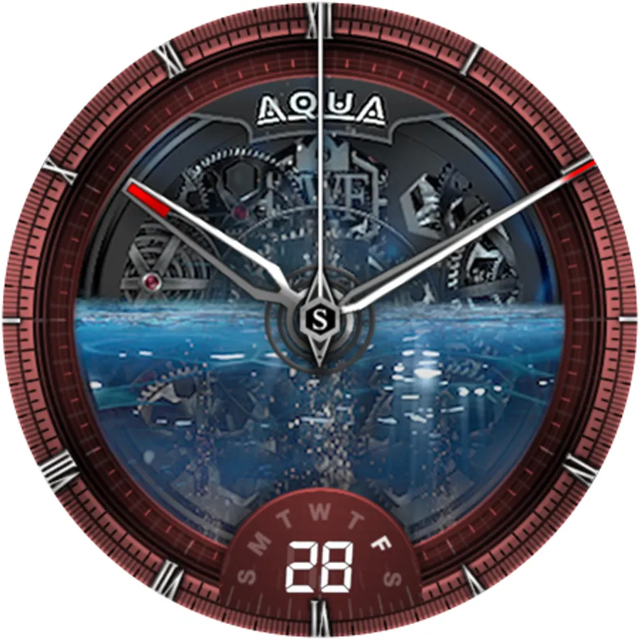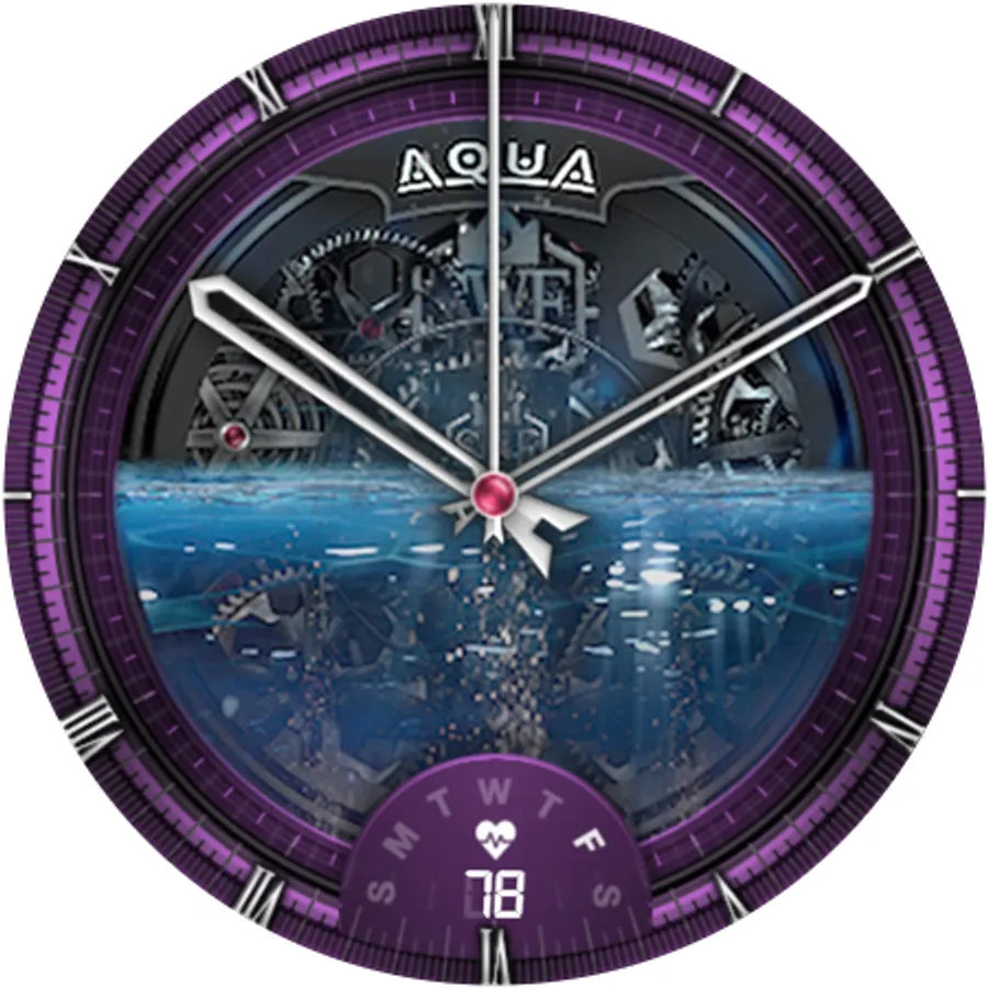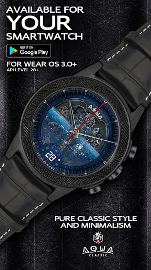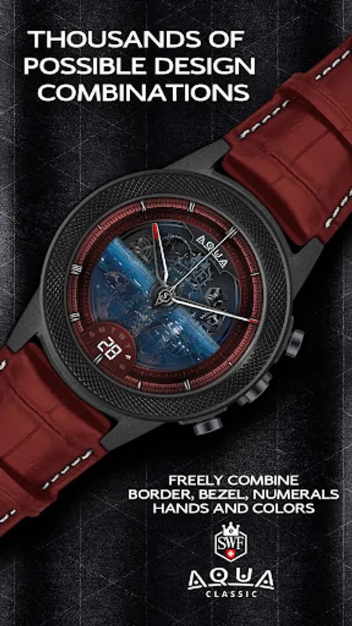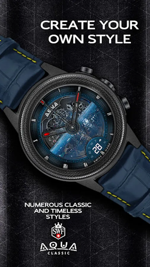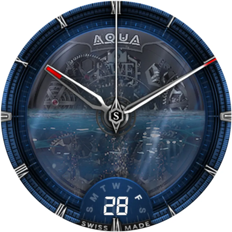 The SWF Aqua Classic watch face impresses with a detailed animated clockwork and allows you to create thousands of different combinations by freely combining border, bezel, numerals, hands, colors and more.