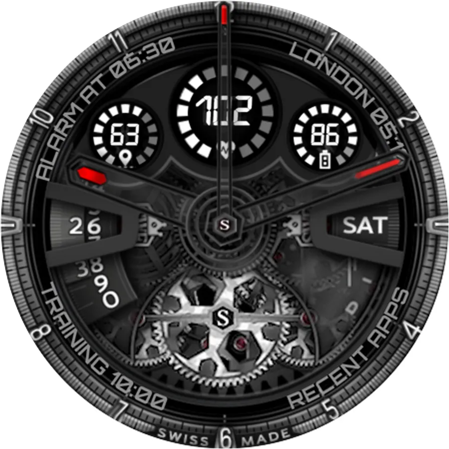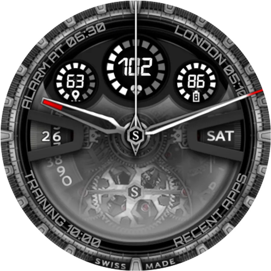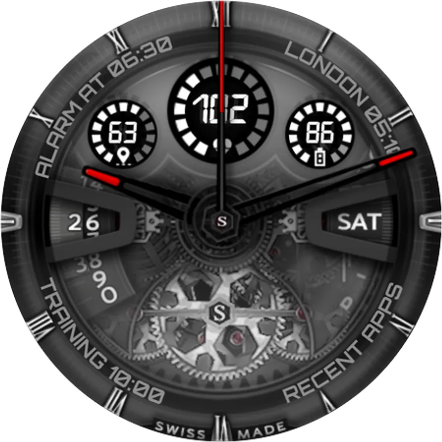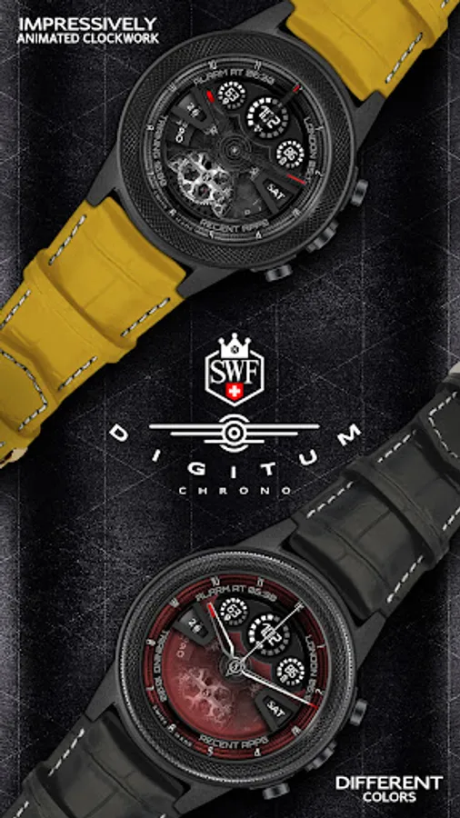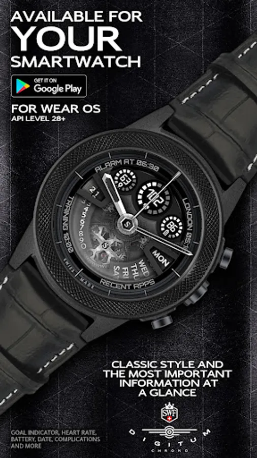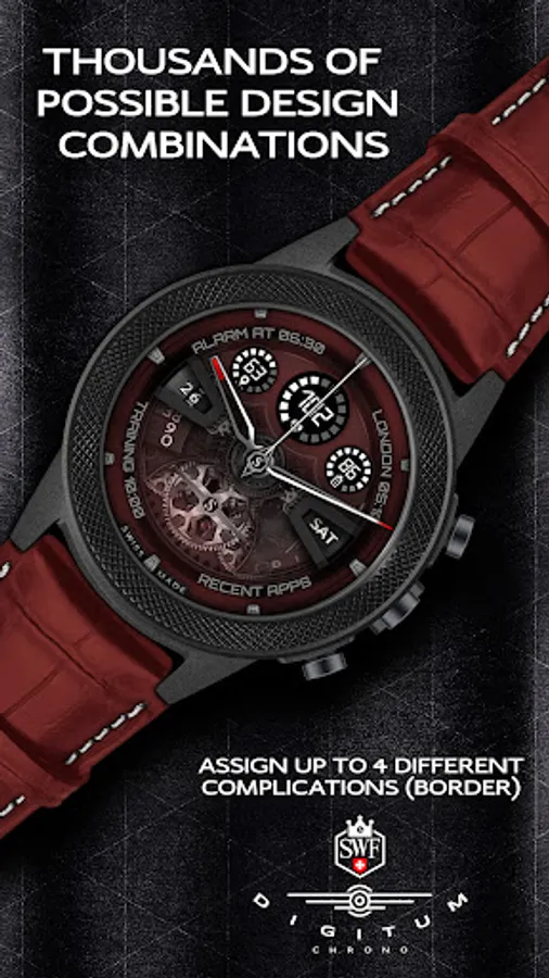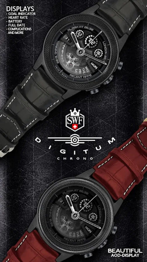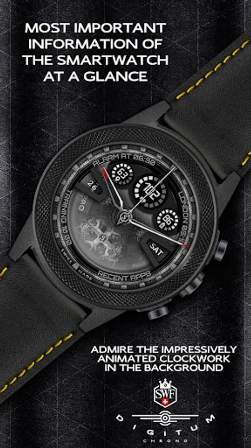 SWF Swiss Watch Faces are crafted and made in Switzerland and showing an very high grade of details. With it's clear and modern design, the SWF Digitum Chrono edition is built to guide you through the time of each day. Admire the impressively animated clockwork in the background while in the foreground important smartwatch information are displayed at a glance.