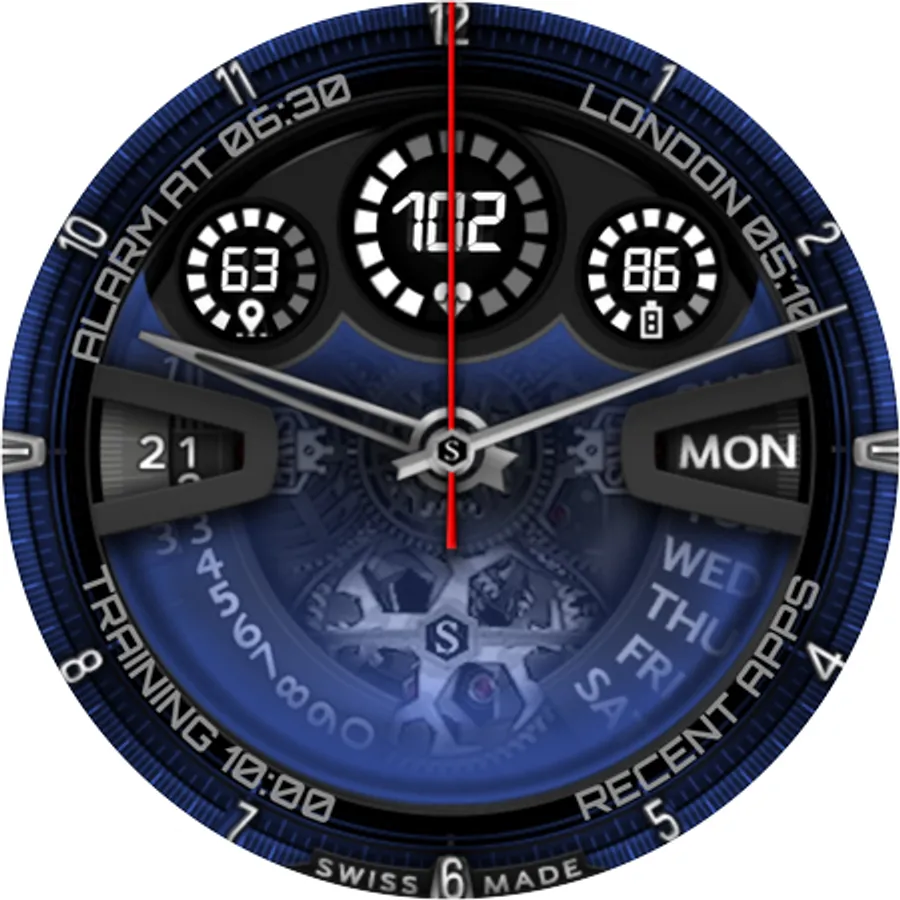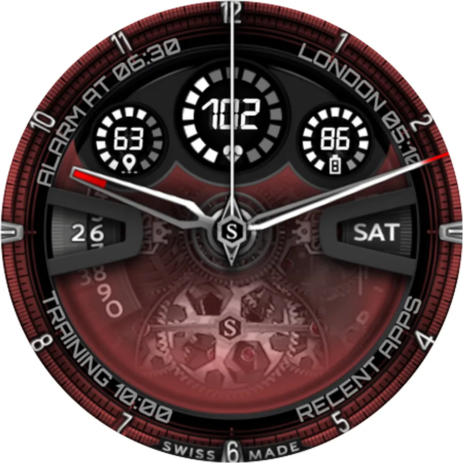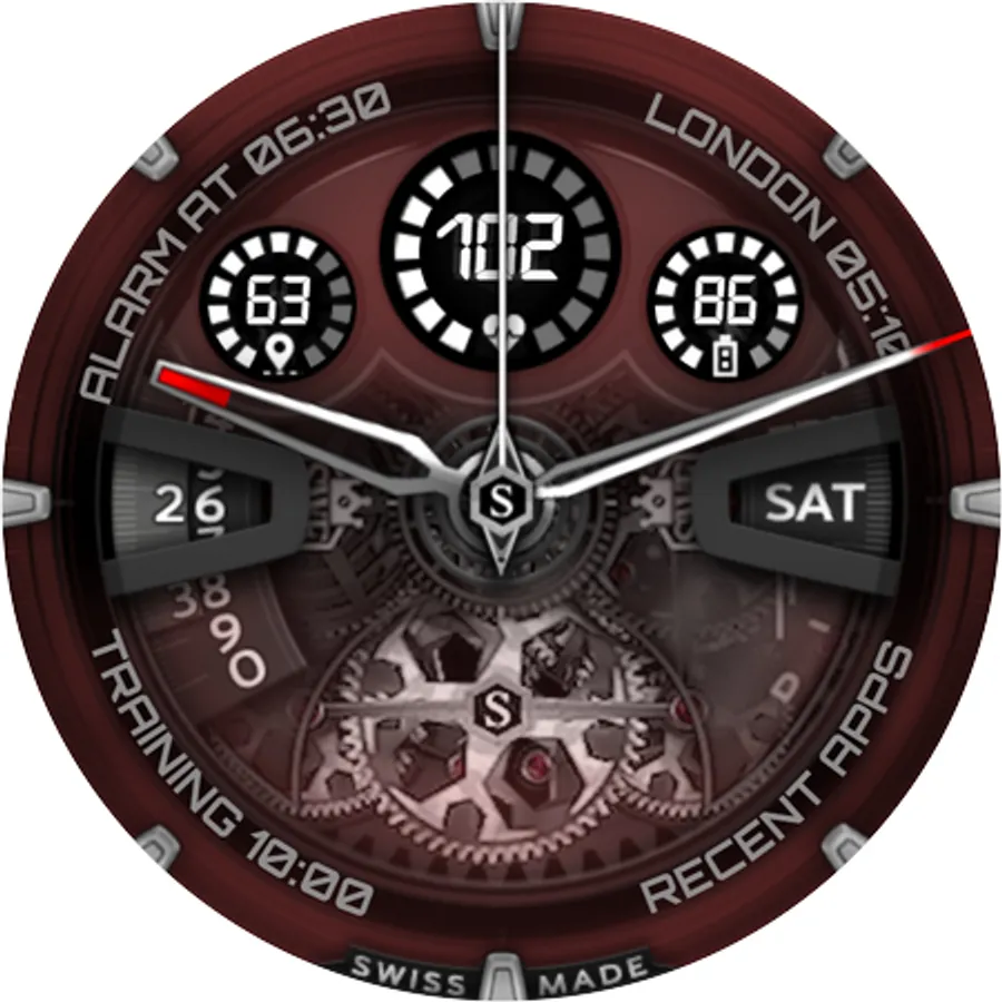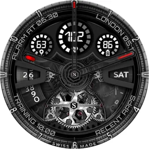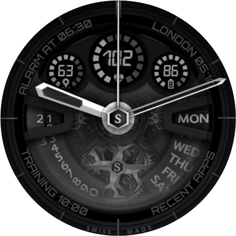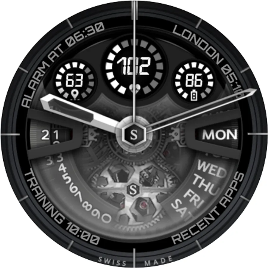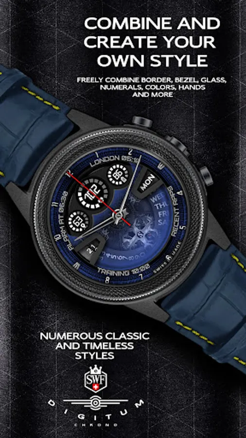 SWF Swiss Watch Faces are crafted and made in Switzerland and showing an very high grade of details. With it's clear and modern design, the SWF Digitum Chrono edition is built to guide you through the time of each day. Admire the impressively animated clockwork in the background while in the foreground important smartwatch information are displayed at a glance.