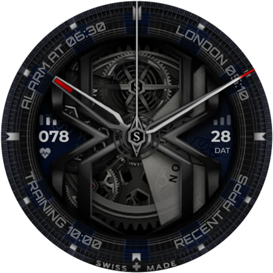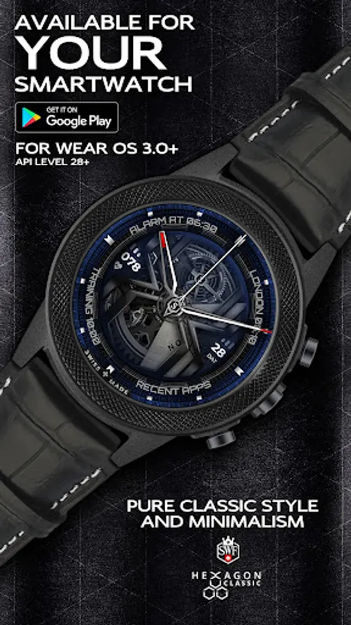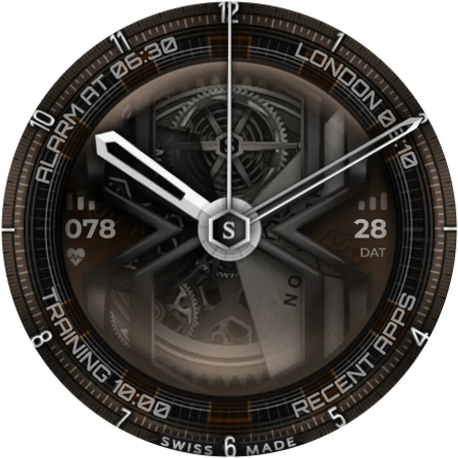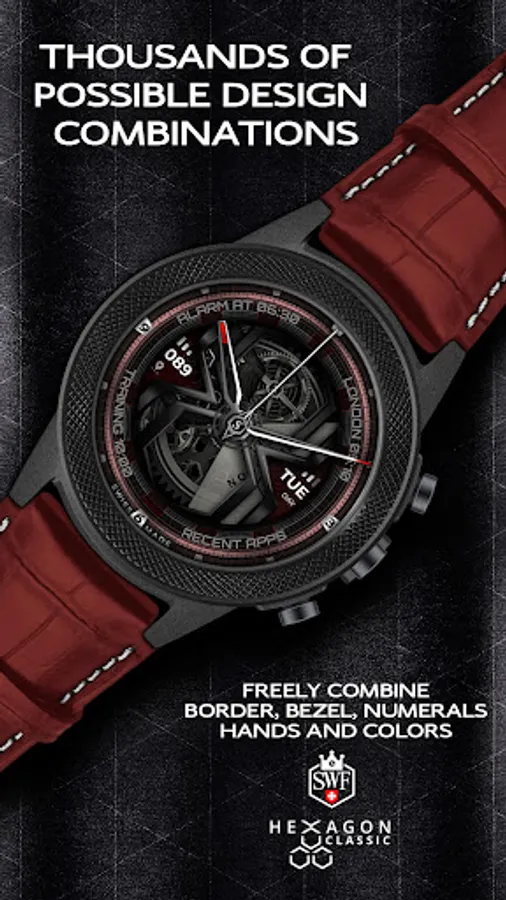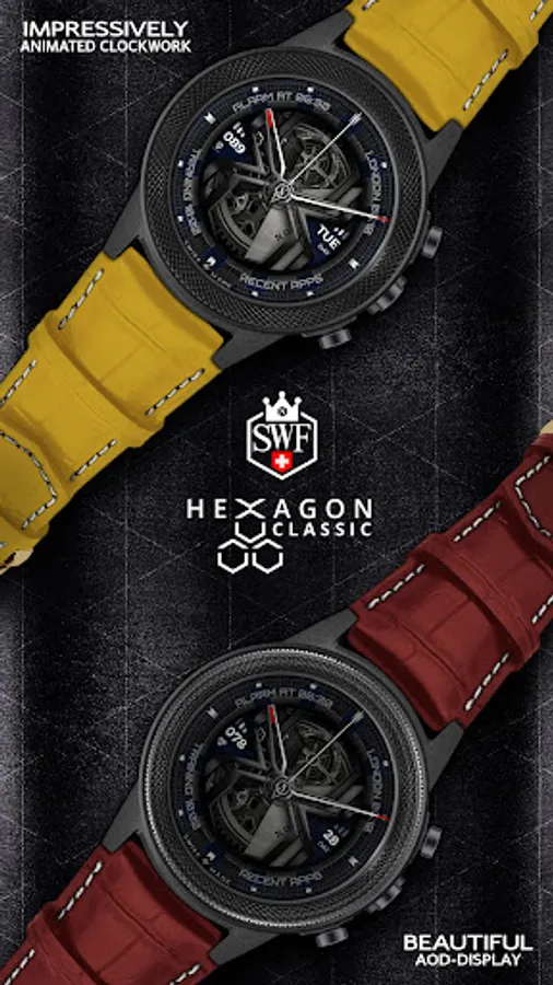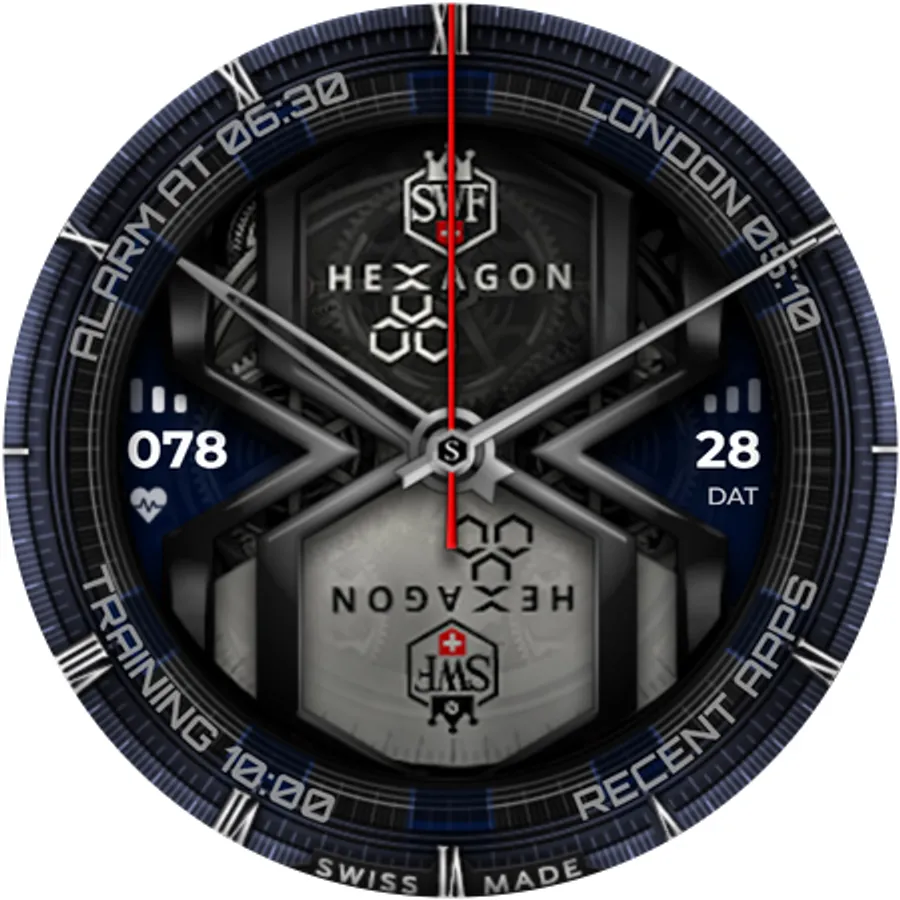The SWF Hexagon Classic watch face impresses with a detailed animated clockwork and allows you to create thousands of different combinations by freely combining border, bezel, numerals, hands, colors and more.