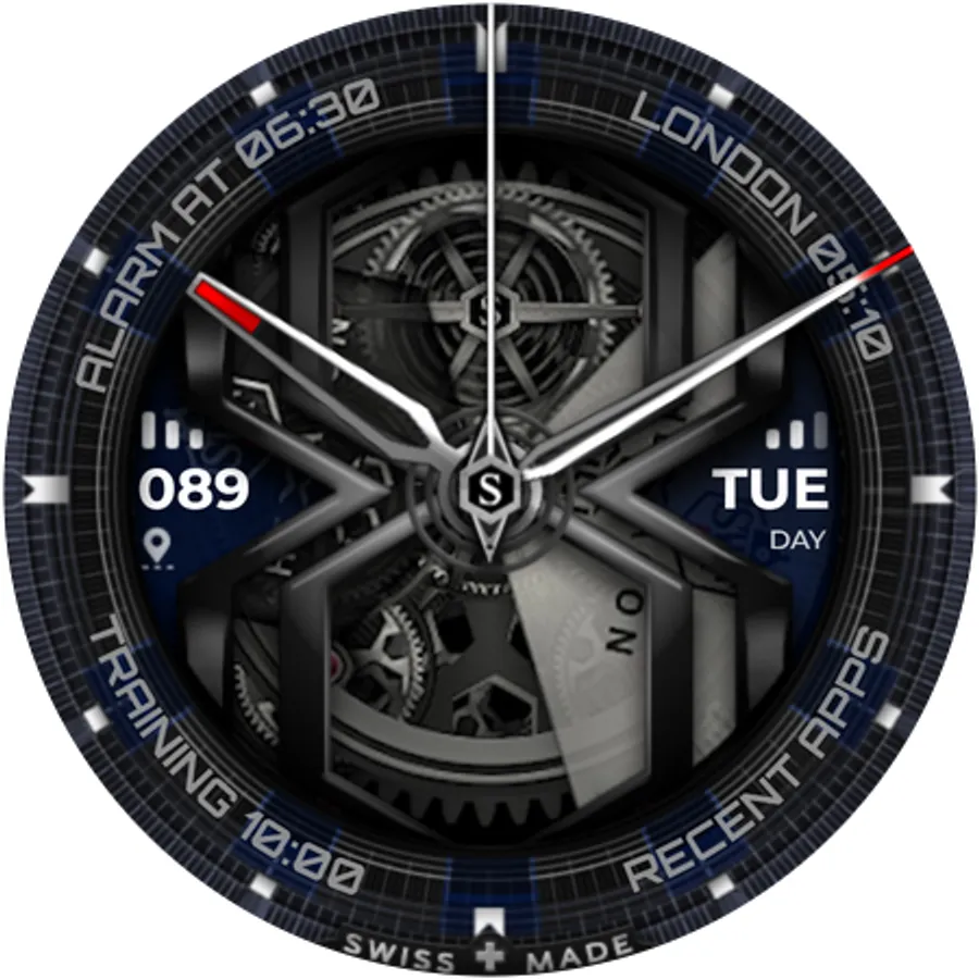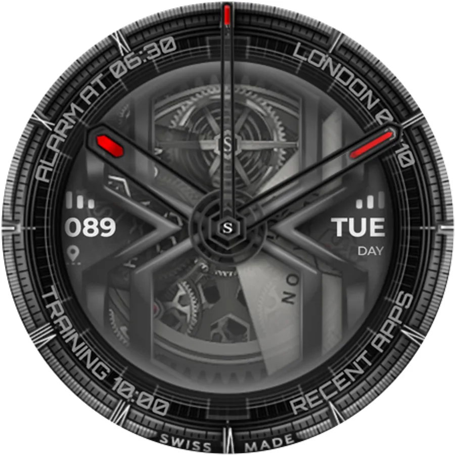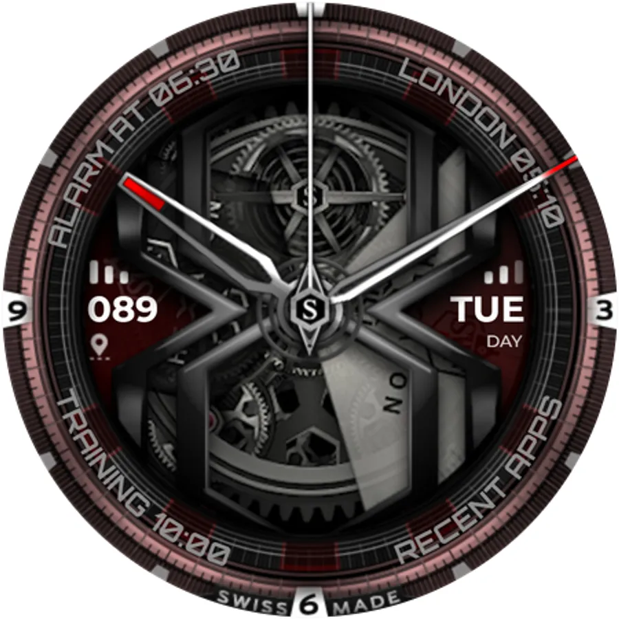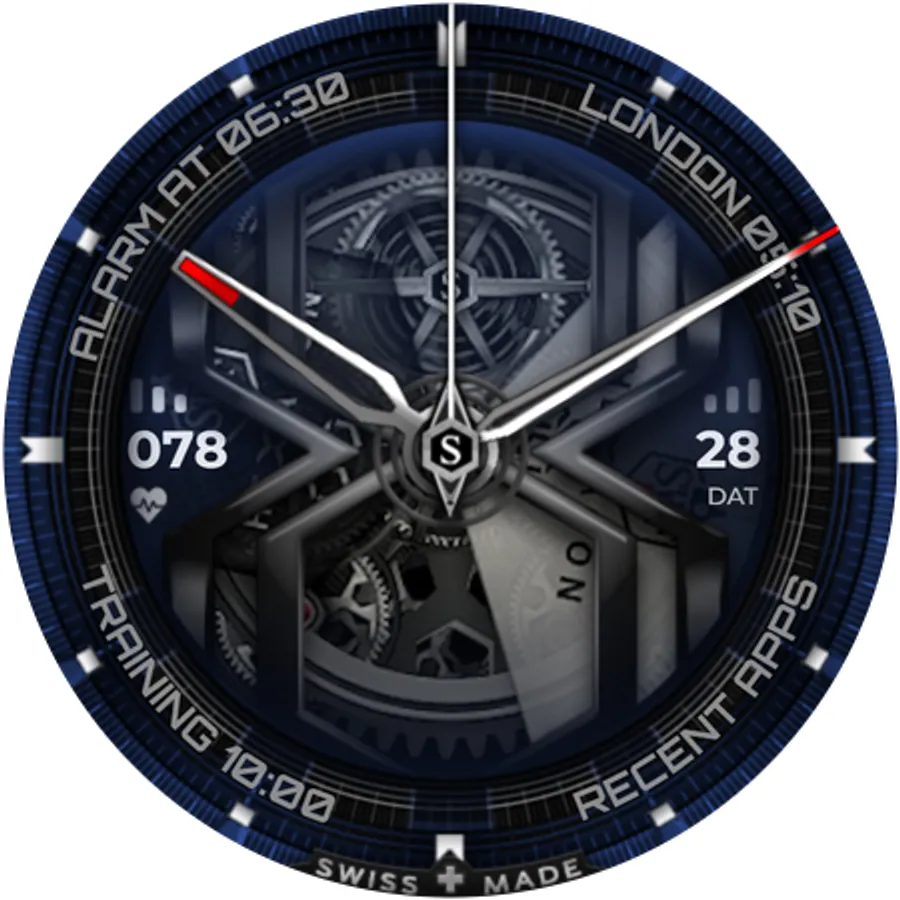 The SWF Hexagon Classic watch face impresses with a detailed animated clockwork and allows you to create thousands of different combinations by freely combining border, bezel, numerals, hands, colors and more.