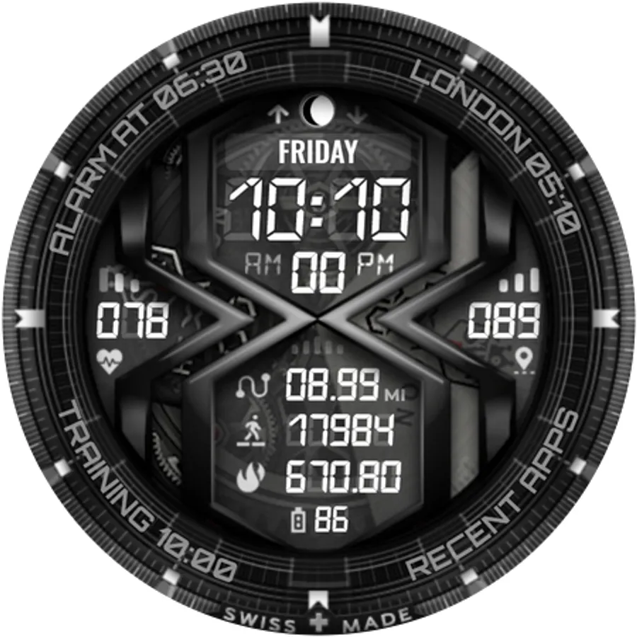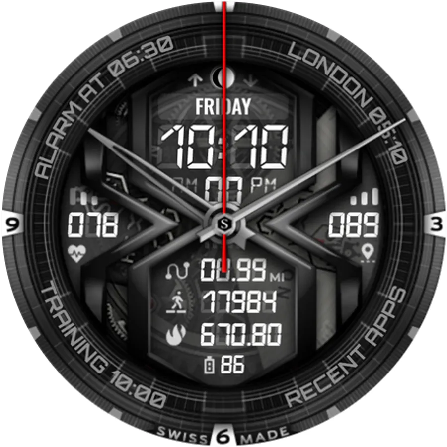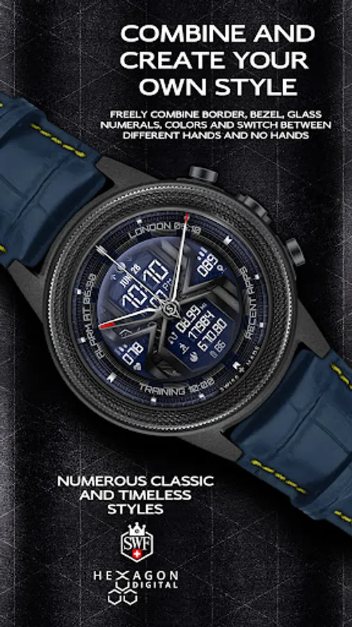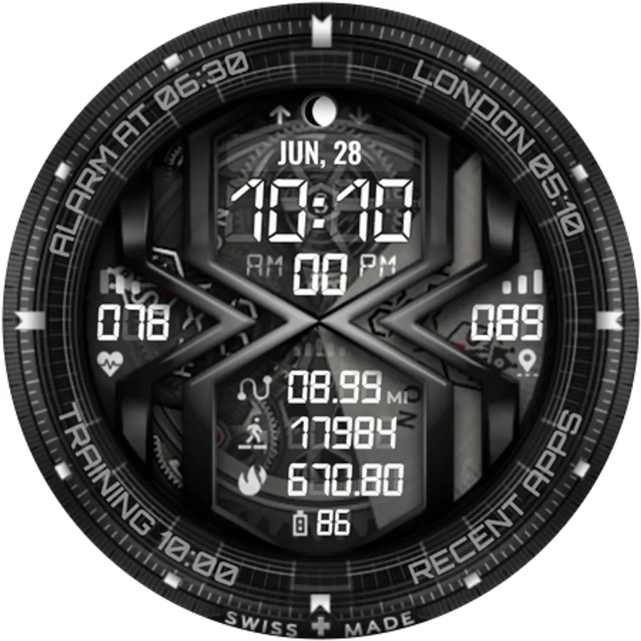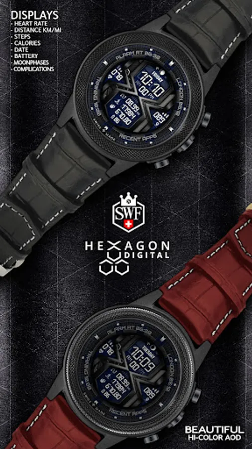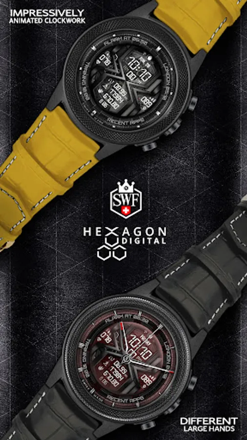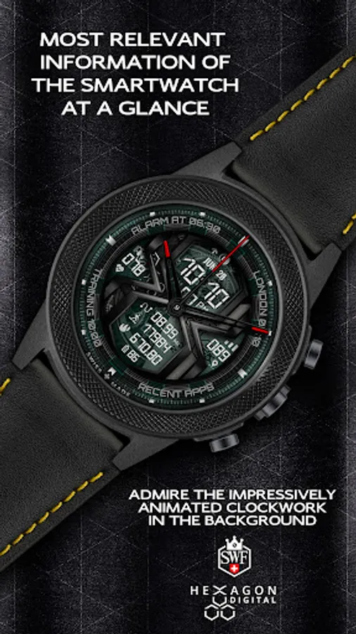 SWF Swiss Watch Faces are crafted and made in Switzerland and showing an very high grade of details. With it's clear and modern design, the SWF Hexagon Digital edition is built to guide you through the time of each day. Admire the impressively animated clockwork in the background while in the foreground most smartwatch information are displayed at a glance.