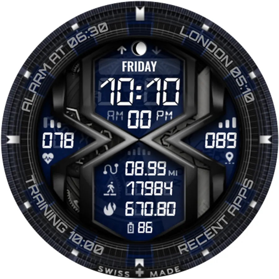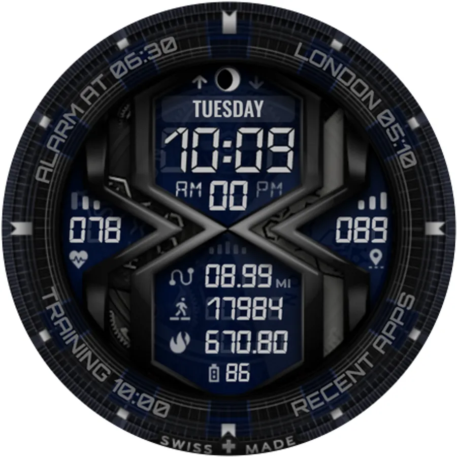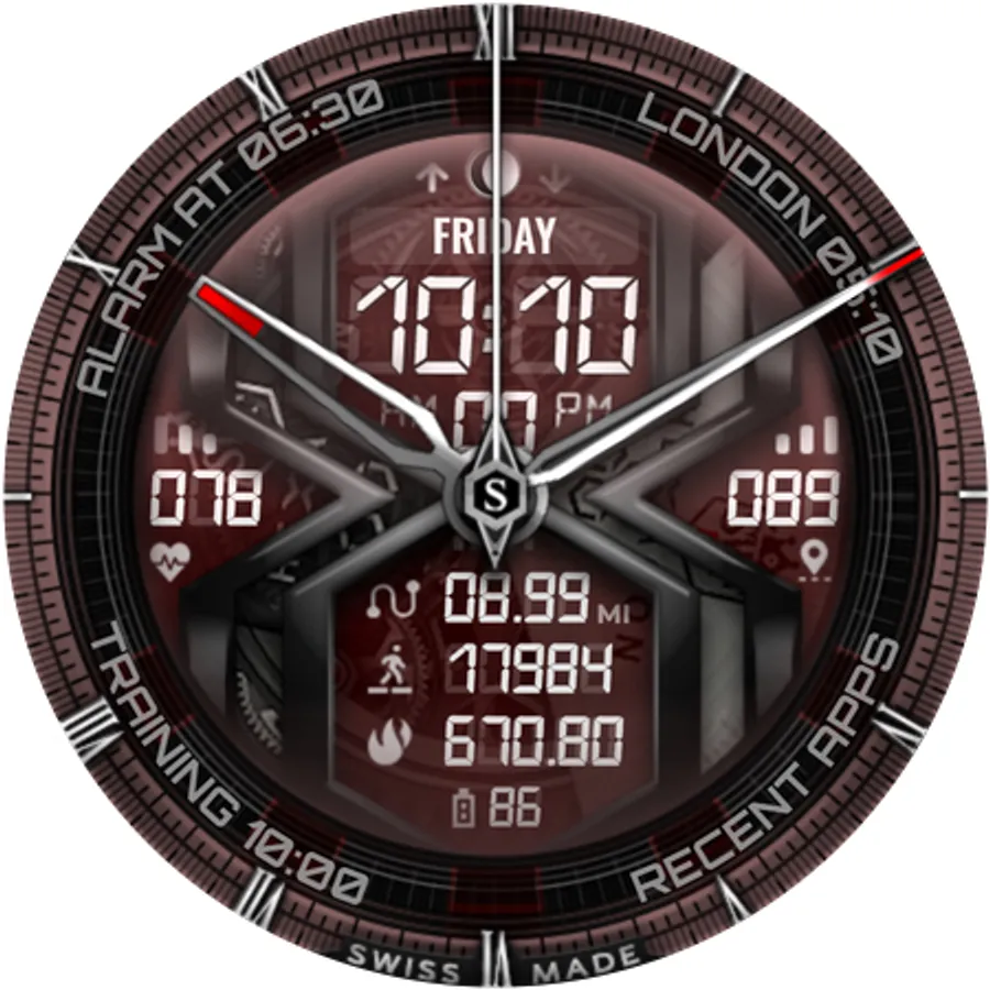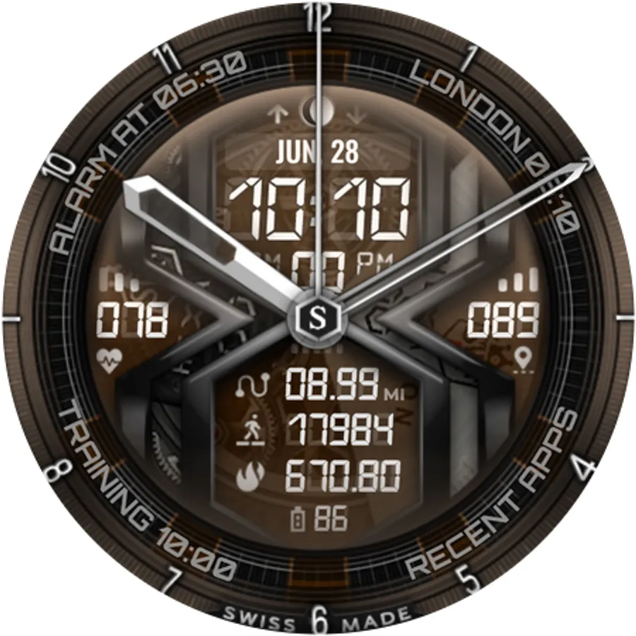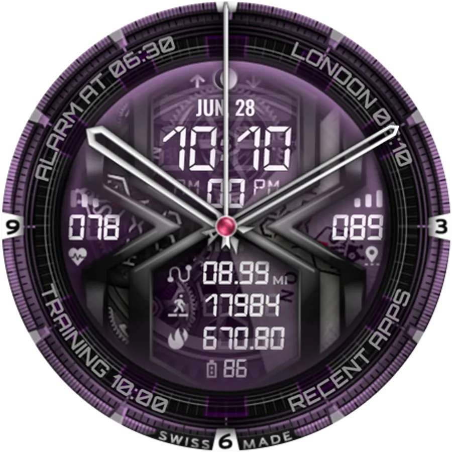 SWF Swiss Watch Faces are crafted and made in Switzerland and showing an very high grade of details. With it's clear and modern design, the SWF Hexagon Digital edition is built to guide you through the time of each day. Admire the impressively animated clockwork in the background while in the foreground most smartwatch information are displayed at a glance.