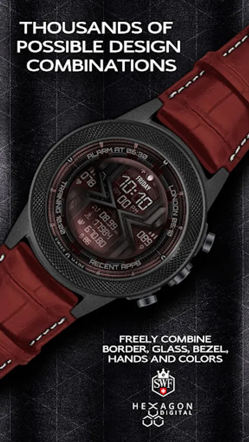 The SWF Hexagon Digital PRO Series allows you to create thousands of different combinations by freely combining border, bezel, glass, numerals, quarters, hands, colors and more.