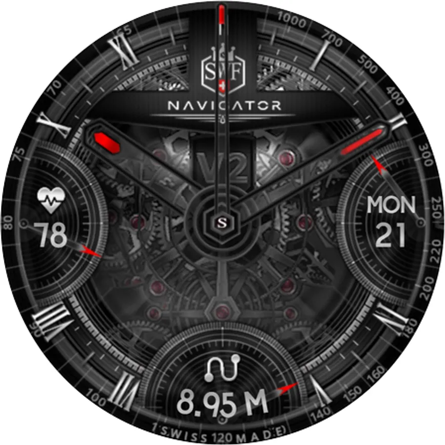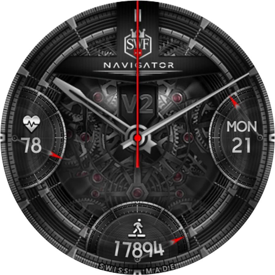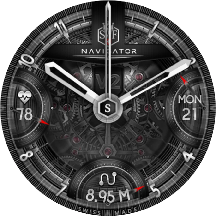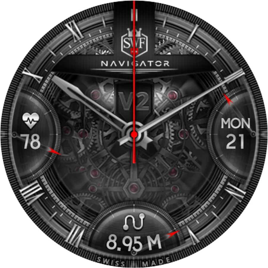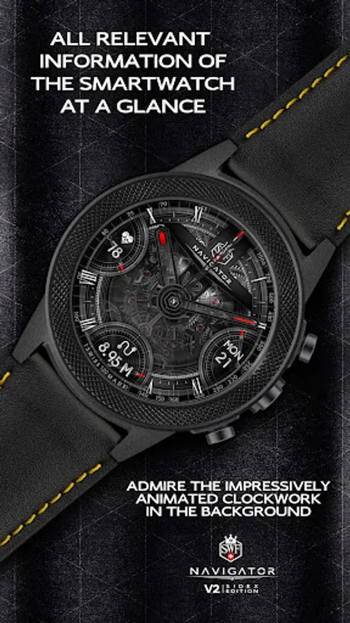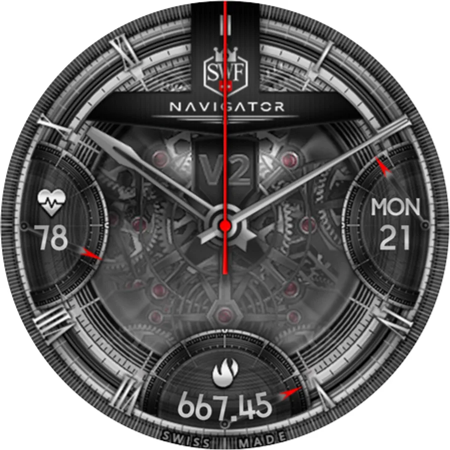 With it's clear and modern design, the SWF Navigator V2 SideX Edition is built to guide you through the time of each day. Admire the impressively animated clockwork in the background while in the foreground most smartwatch information within the chronometers are displayed at a glance.