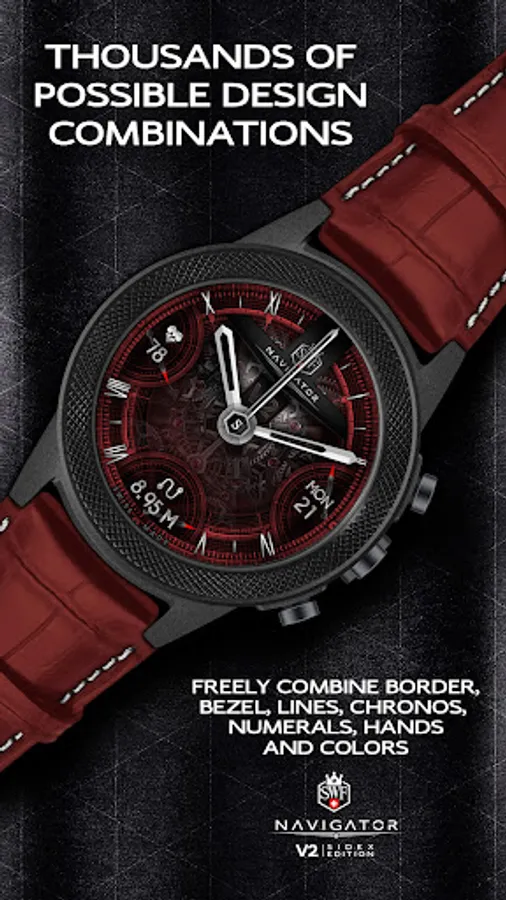 The SWF Navigator V2 SideX PRO Series impresses with a detailed animated clockwork and allows you to create thousands of different combinations by freely combining border, bezel, lines, chronos, numerals, hands and colors. The PRO Series allows you to configure up to 8 custom apps on your watch face.