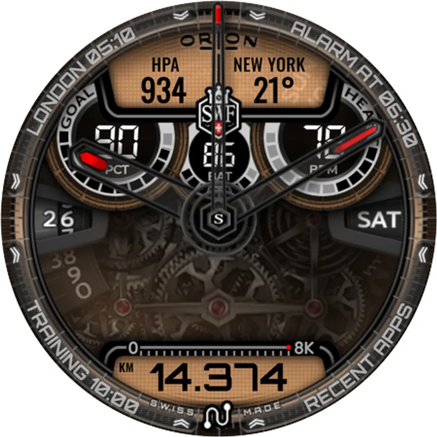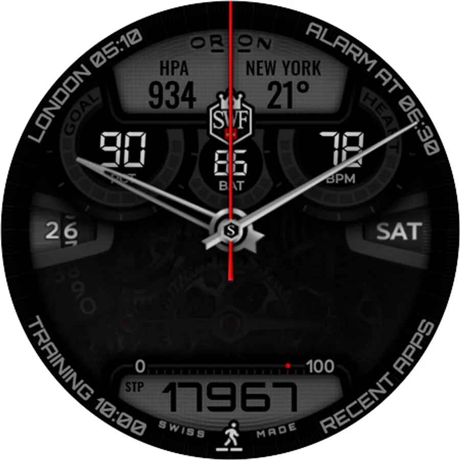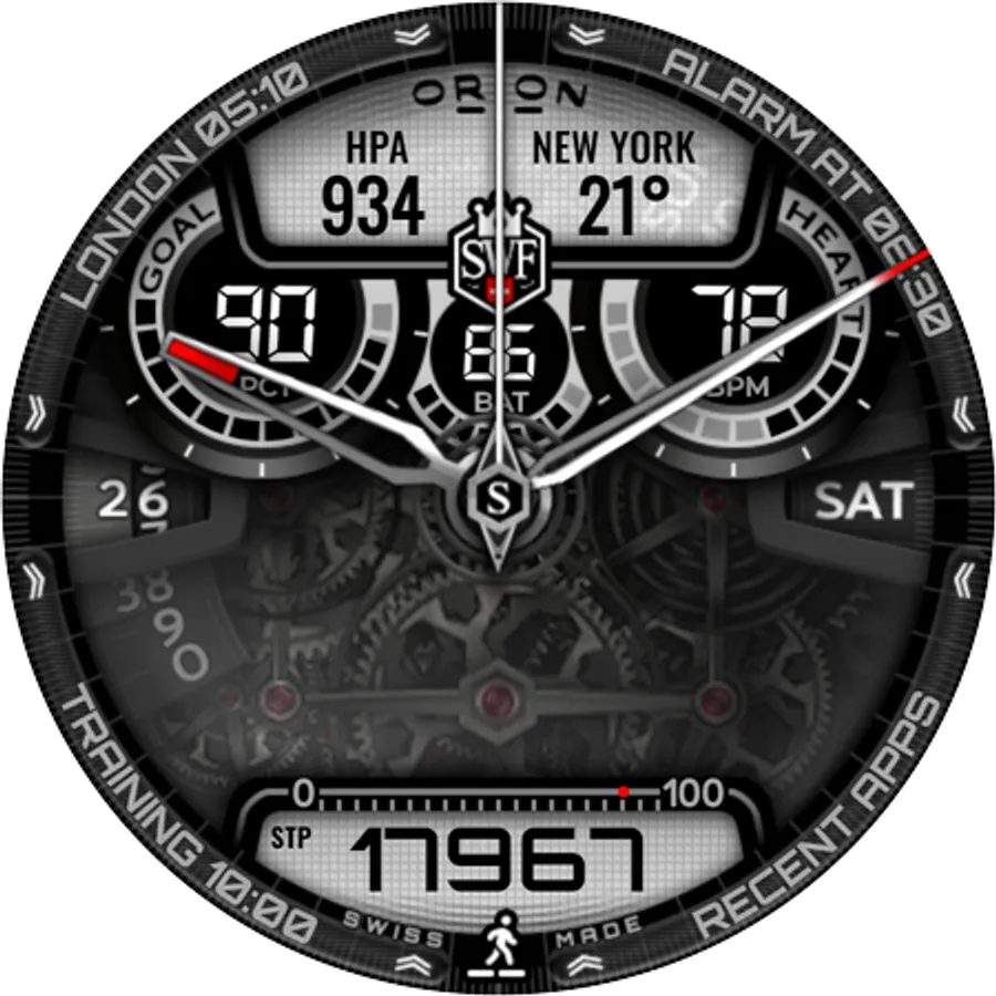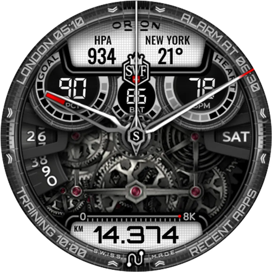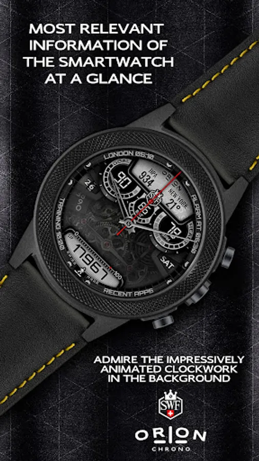 With it's clear and modern design, the SWF Orion Chrono edition is built to guide you through the time of each day. Admire the impressively animated clockwork in the background while in the foreground most smartwatch information are displayed at a glance.