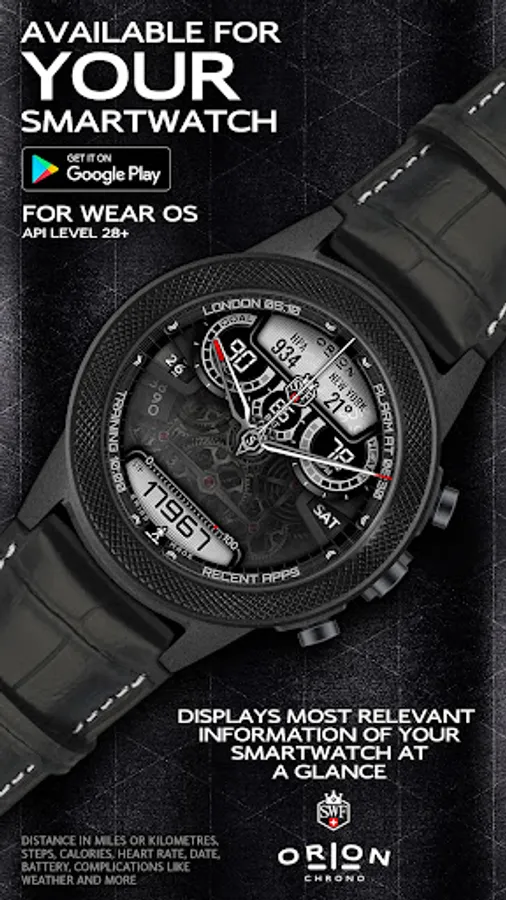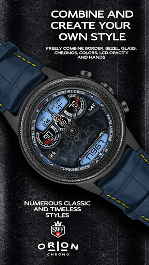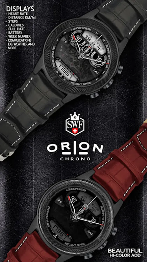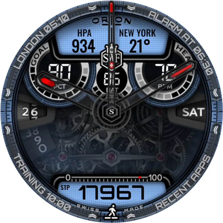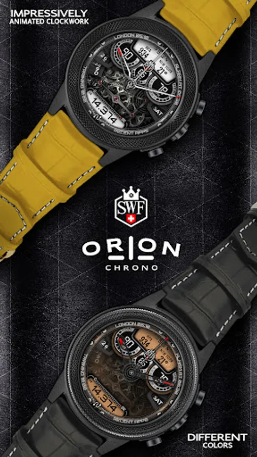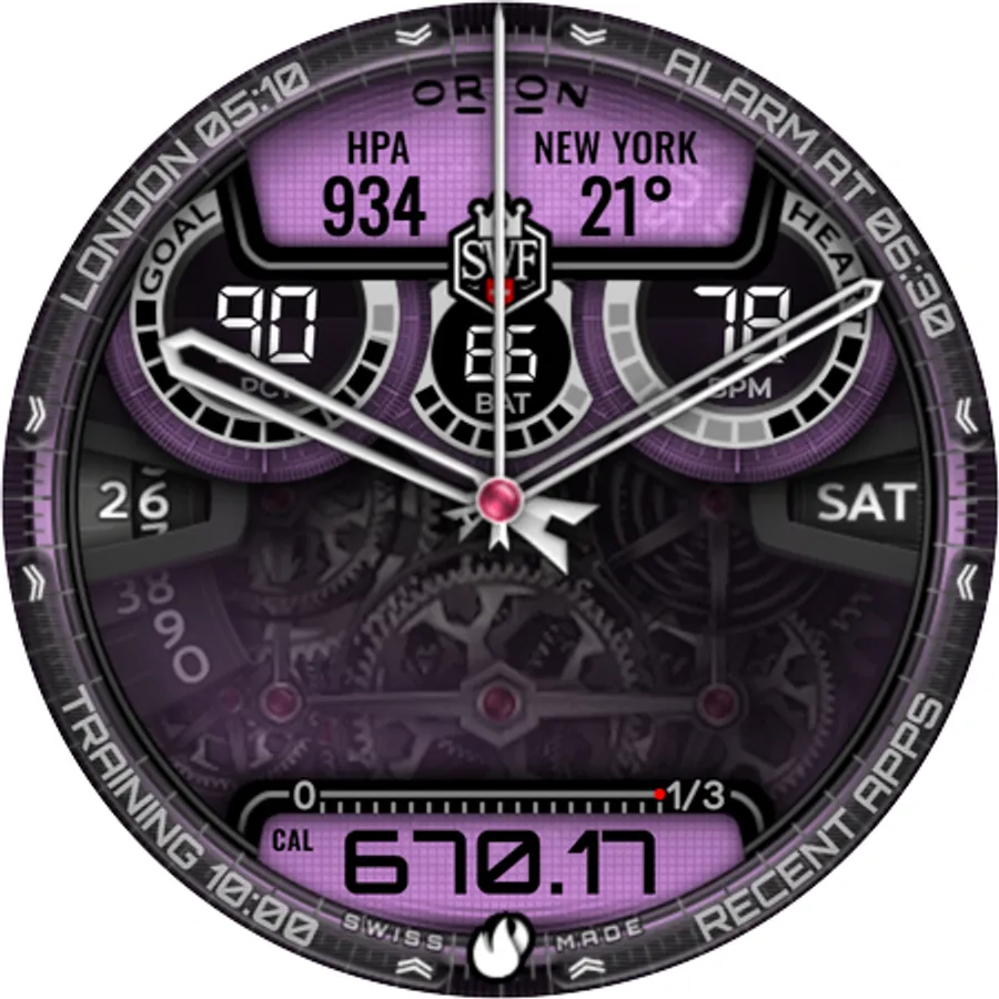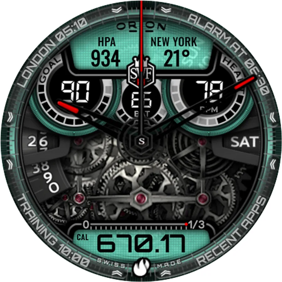 With it's clear and modern design, the SWF Orion Chrono edition is built to guide you through the time of each day. Admire the impressively animated clockwork in the background while in the foreground most smartwatch information are displayed at a glance.
