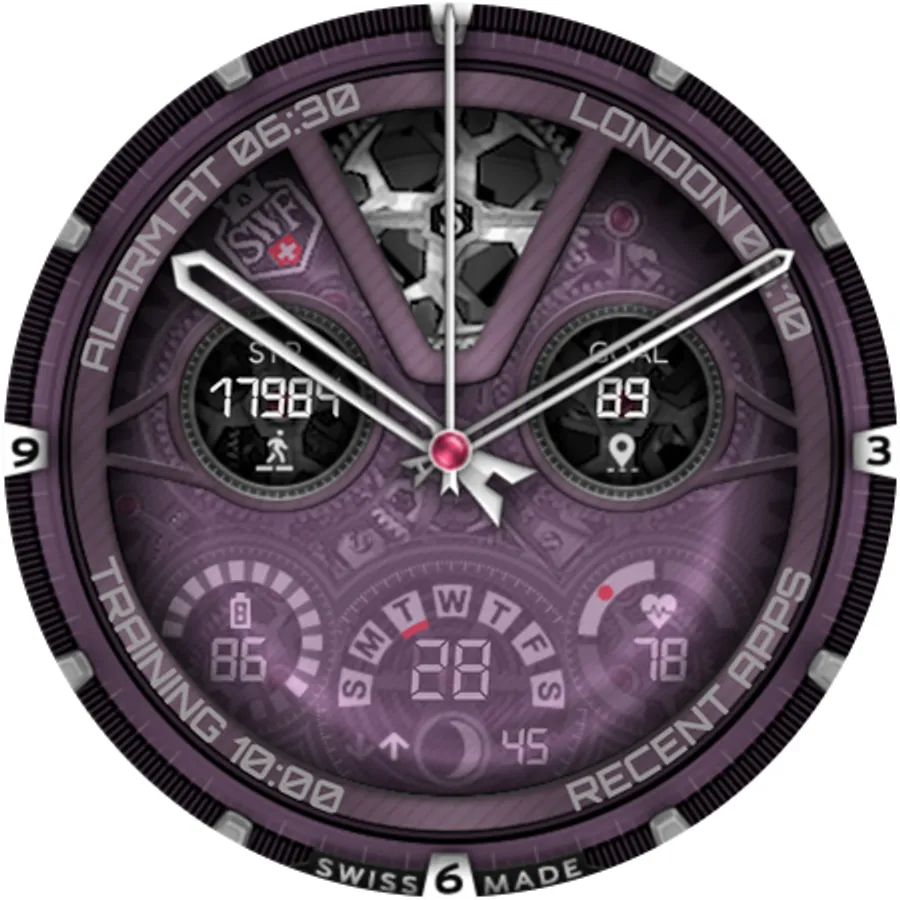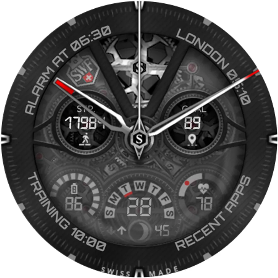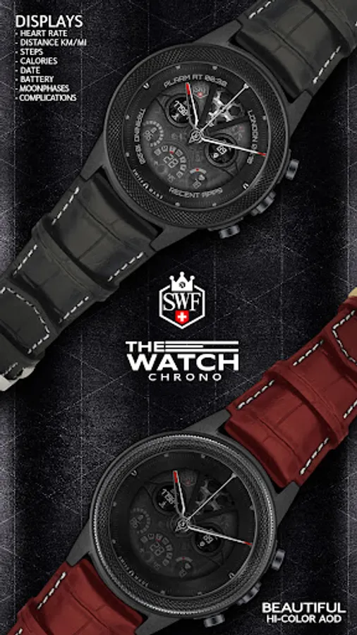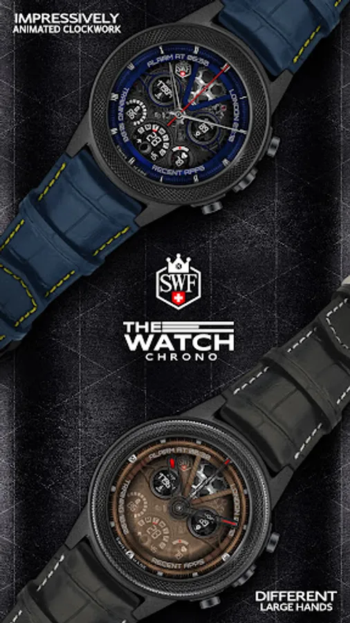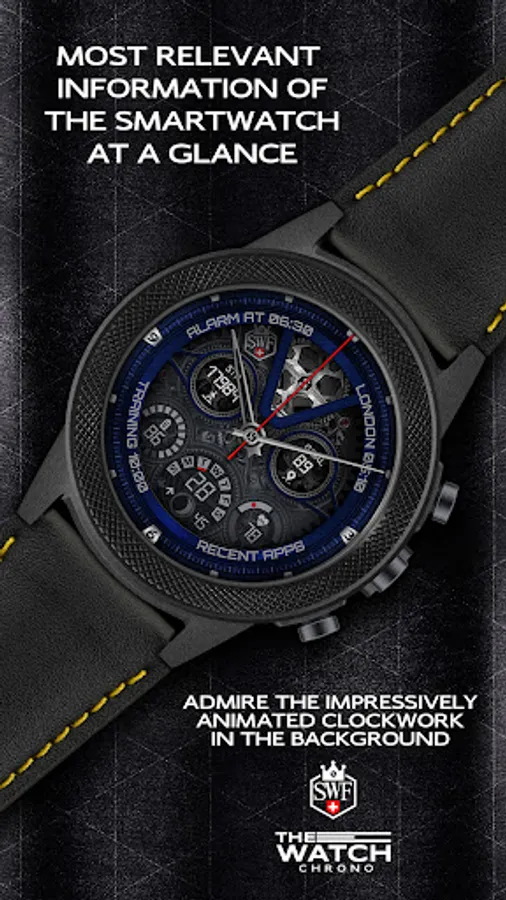SWF Swiss Watch Faces are crafted and made in Switzerland and showing an very high grade of details. With it's clear and modern design, The chrono edition of "The Watch" from SWF is built to guide you through the time of each day. Admire the impressively animated clockwork in the background while in the foreground most smartwatch information are displayed at a glance.