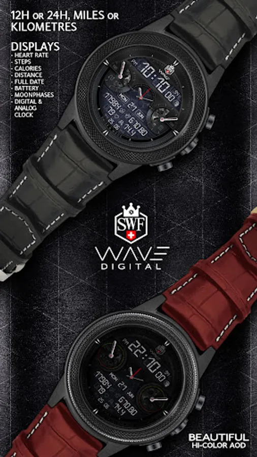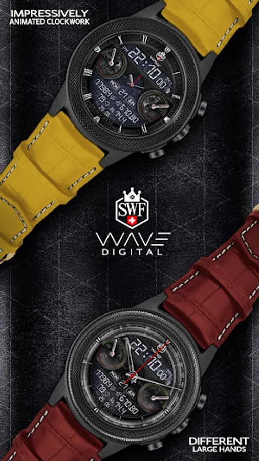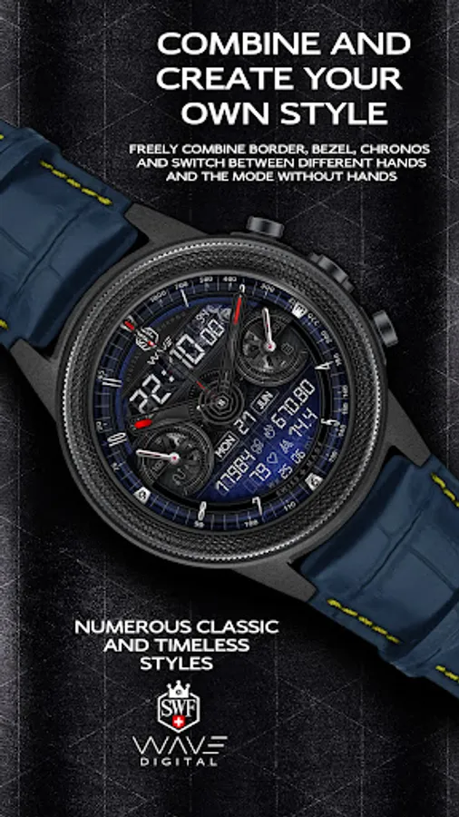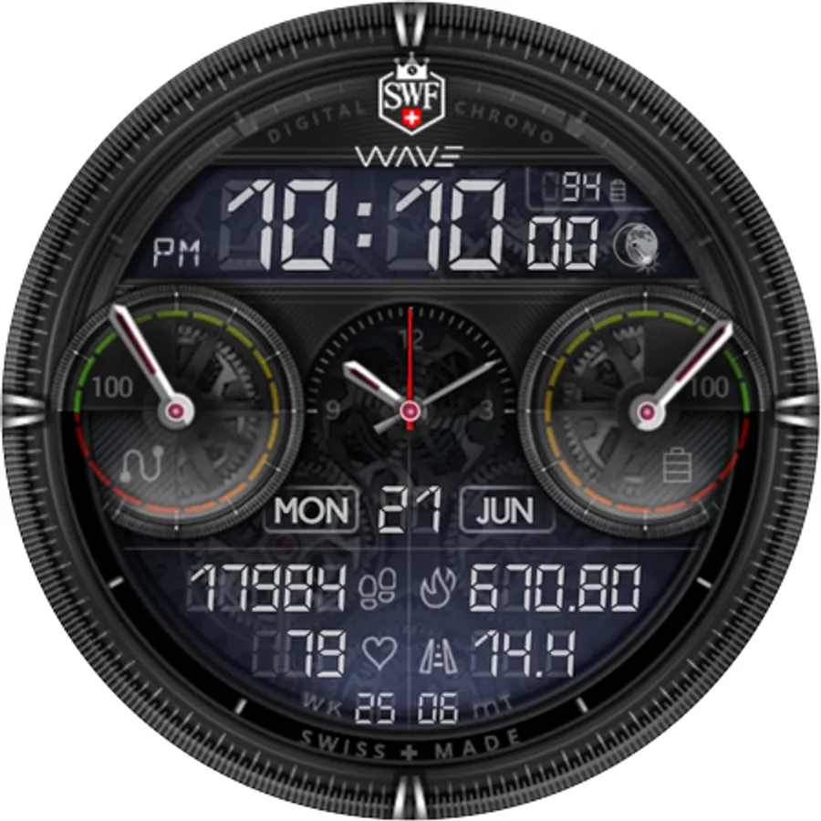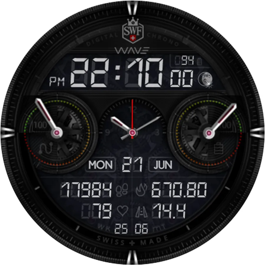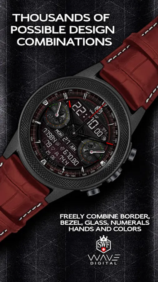 The SWF Wave digital watch face presents itself with a extraordinary, timeless and elegant swiss design that shows most smartwatch information on your wrist in a clear and concise way. The SWF Wave Digital PRO Series allows you to create thousands of different combinations by freely combining border, bezel, glas, numerals, hands and colors.