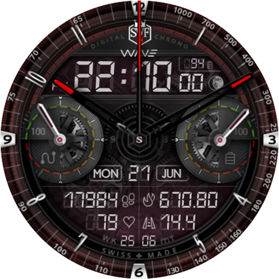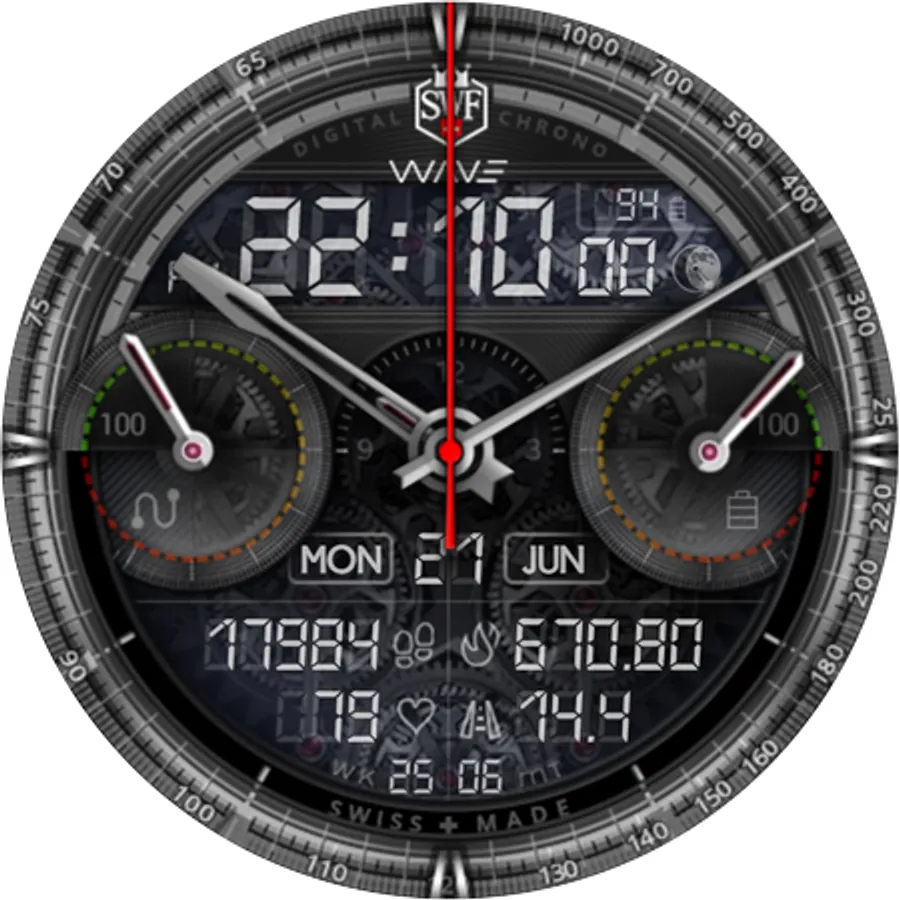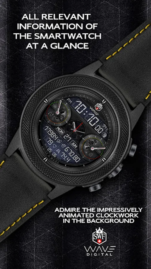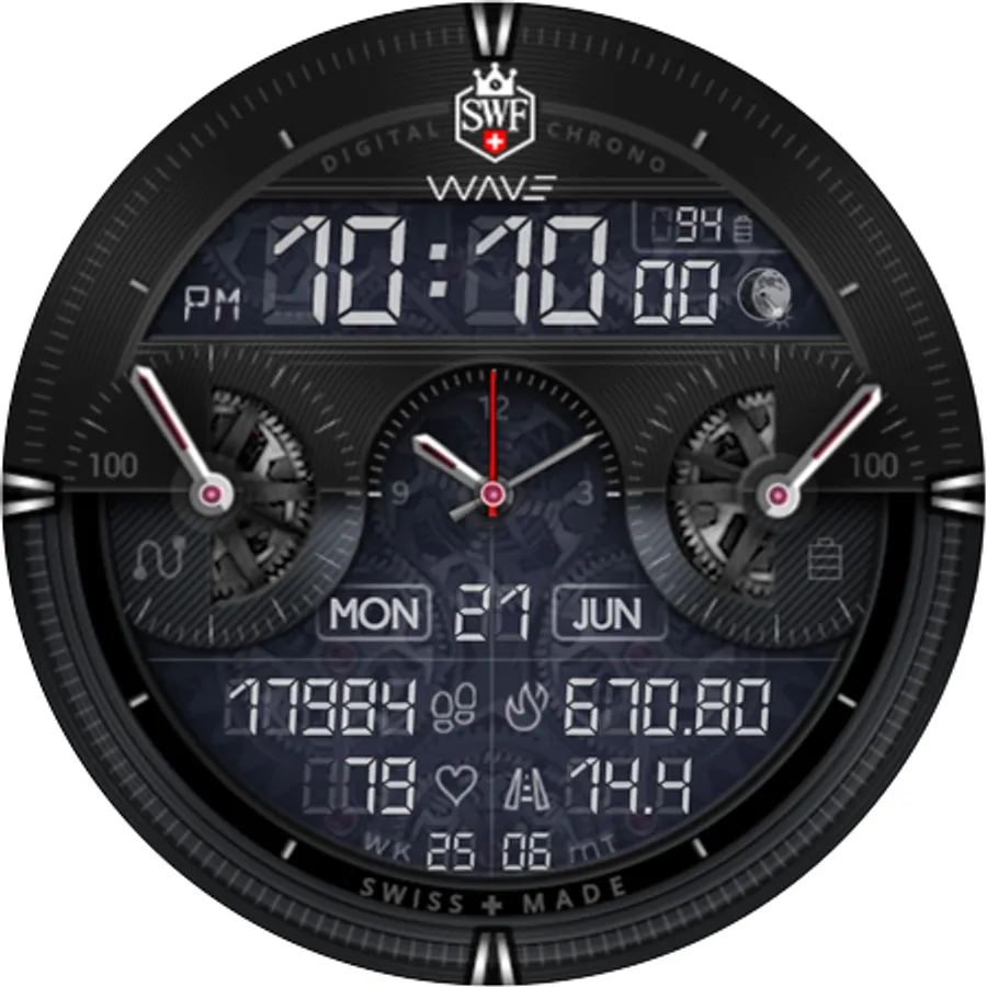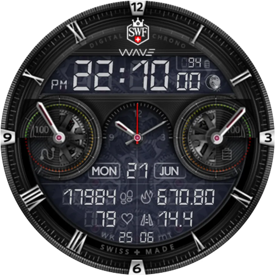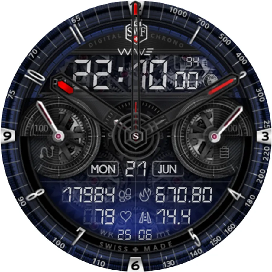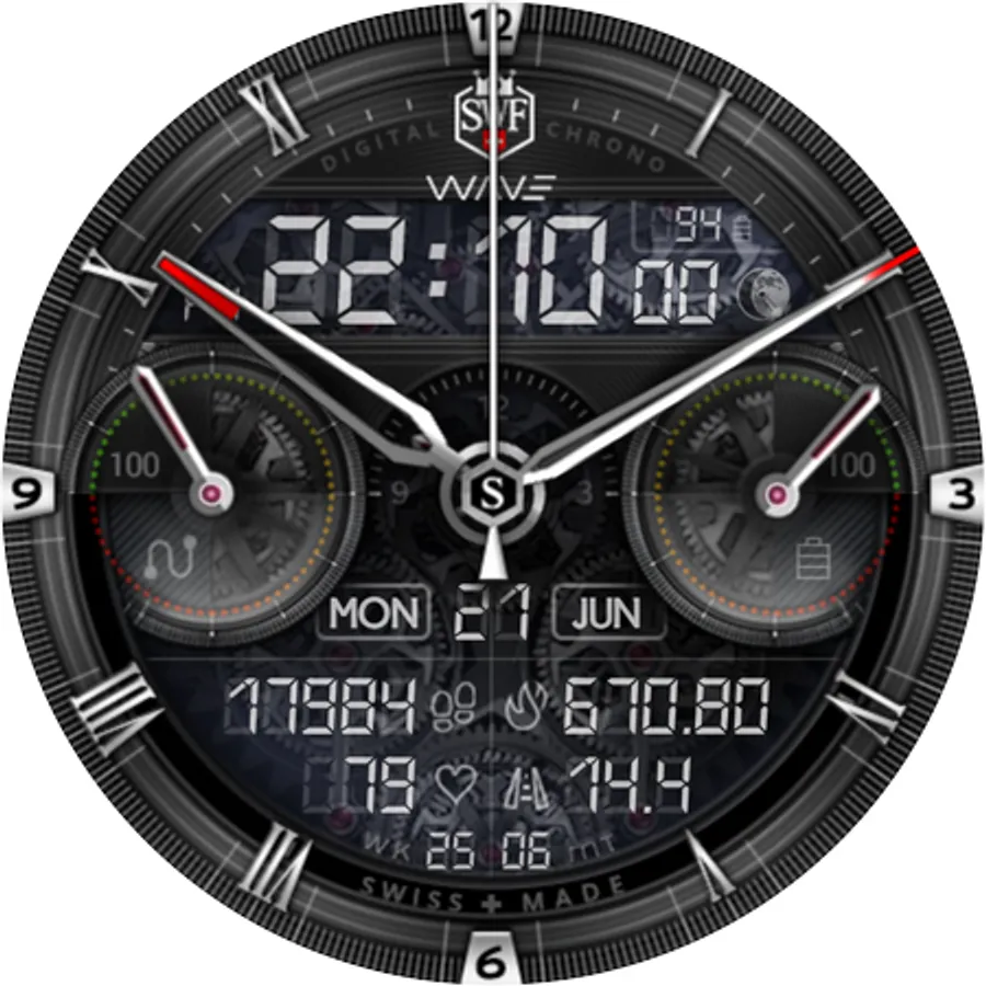 With it's clear and modern design, the SWF Wave digital watch face is built to guide you through the time of each day. Admire the impressively animated clockwork in the background while in the foreground most smartwatch information are displayed at a glance.