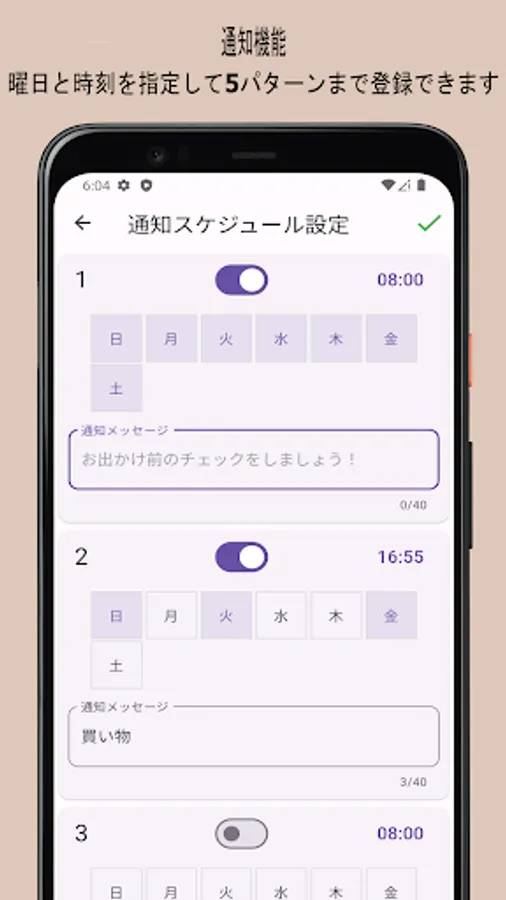 - Equipped with notification function. You can register the day of the week and time to be notified when you go out. Up to 5 patterns can be registered.