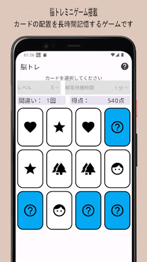 - Equipped with brain training mini games. This is a game that trains your brain by memorizing the arrangement of cards for a long time.