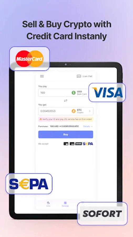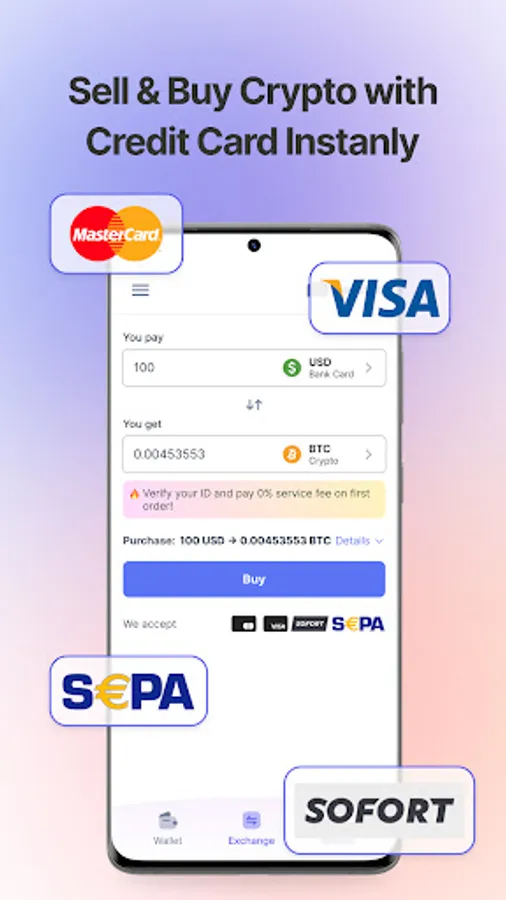 The Switchere app allows you to buy, sell, or exchange BTC, LTC, ETH, USDT20, CCD, XRP, TRX, BNBBSC, XLM, EUR, SOL, BCH, and all leading cryptocurrencies with a credit card instantly.