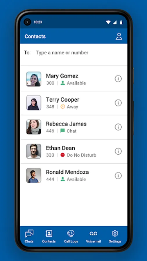 *Change your Status and listen to your Voicemail messages, plus see your Call Log and Favorite contacts.