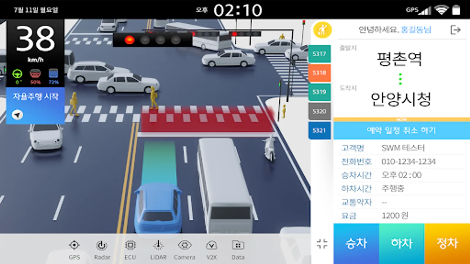 - 3D Driving UI: It consists of a driving simulation screen composed of 3D objects, a UI for status information of each sensor, and a UI for displaying information on traffic signals on the road.
