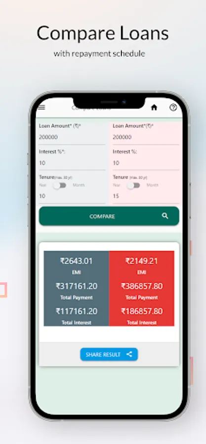 EMI & Loan Calculators is a free loan calculator tool that is useful for your everyday loan payment calculations such EMI Calculator, Loan Amortization Chart, Compare Loans, Loan Eligibility Checker, Interest Rate Checker, and Flexible EMI options.