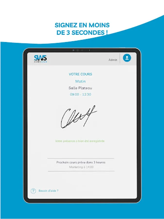 Once the tag has been detected, the application authorizes you to sign in via the signature pad provided for this purpose.