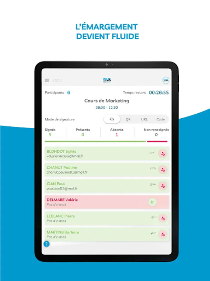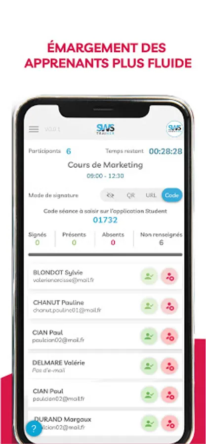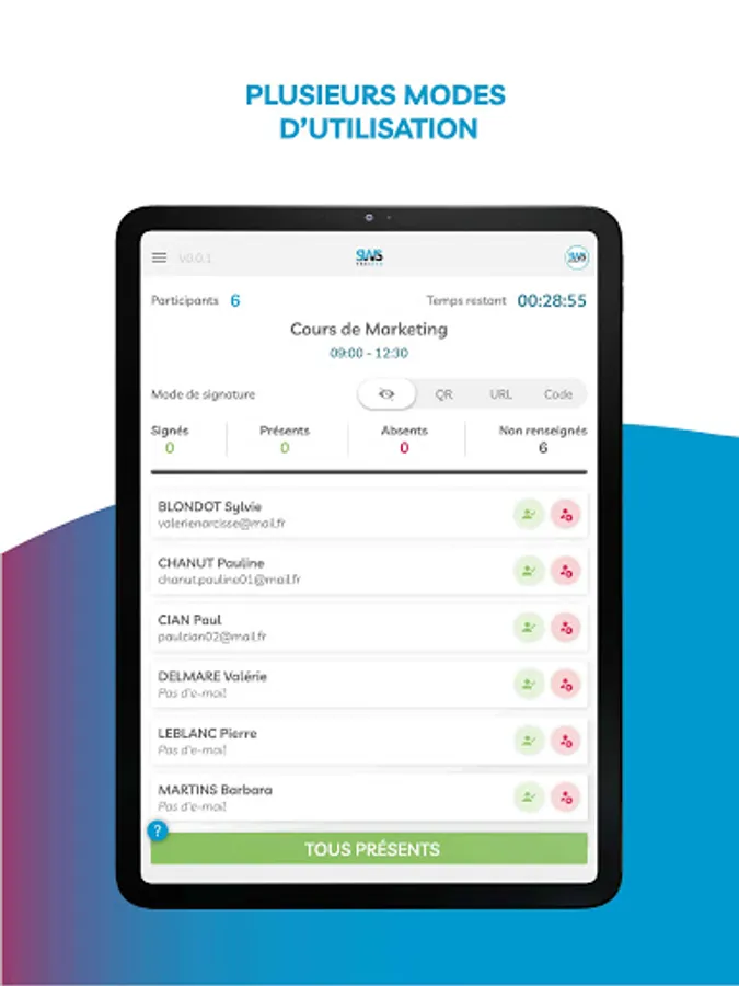 When starting the application, a signature screen will appear. It allows you to sign all your pending requests: catch-ups, remote signatures ... Then sign for the current session before accessing the main screen with the list of learners for this session.