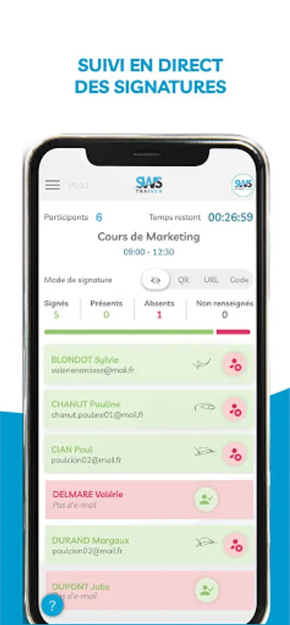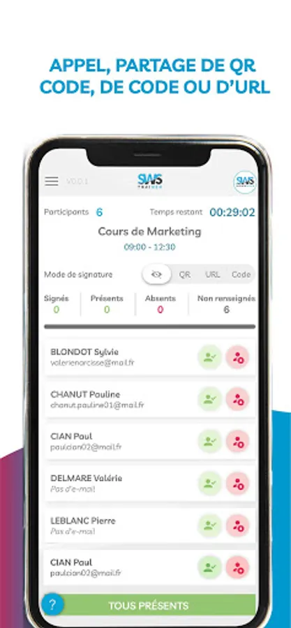 For short and one-off training, a signature portal has been set up. When accessing the session, select the "URL" option at the top right. Then share this URL or the QR Code that contains the URL: via screen sharing, chat or in an email. They will then access the signature portal from which they can sign their presence, with no prior download required.