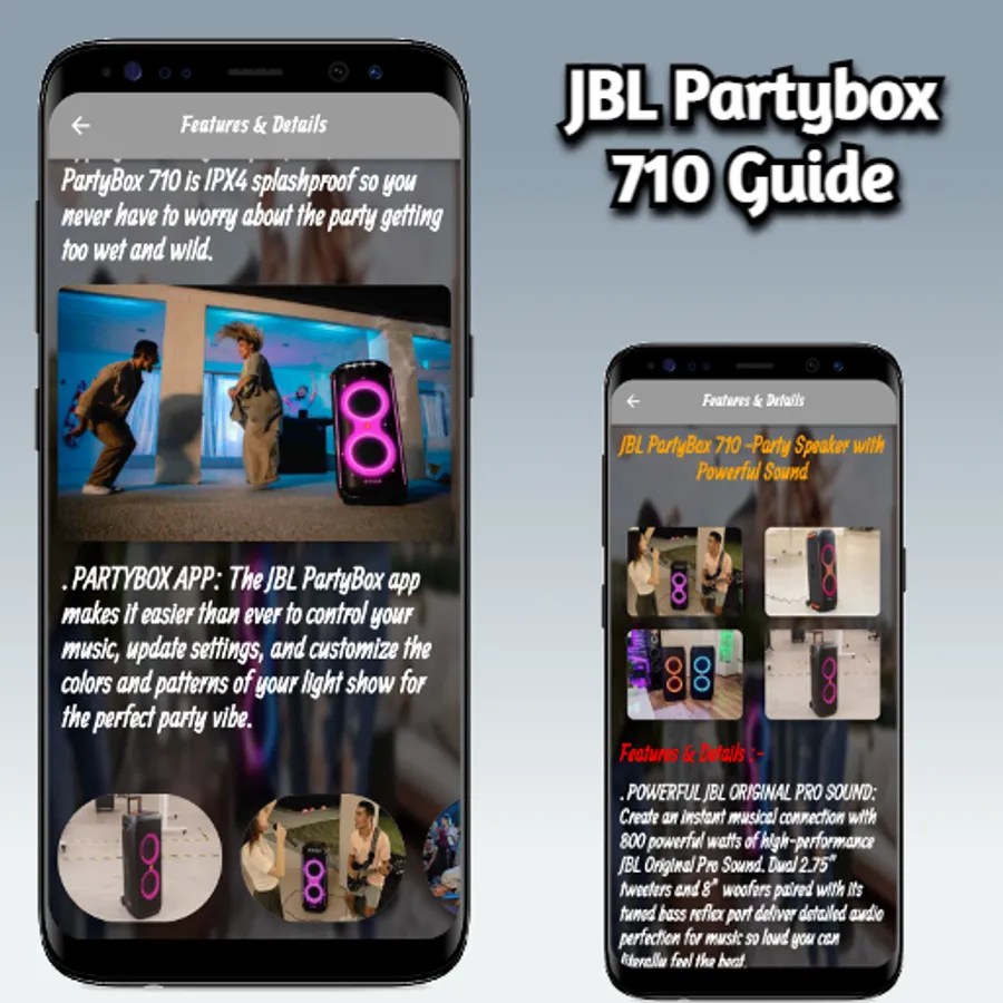 Through the JBL Partybox 710 Guide application, you can also obtain the JBL Partybox 710 user guide, which it provides in a clear and easy way. You can also view all the details and information of the JBL Partybox 710 in one place, through the JBL Partybox 710 Guide application. IPX4 SPLASHPROOF: Whether you're partying with friends in your backyard or sipping drinks by the pool, the JBL PartyBox 710 is IPX4 splashproof so you never have to worry about the party getting too wet and wild.