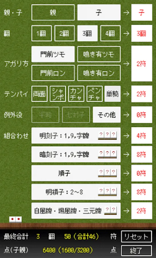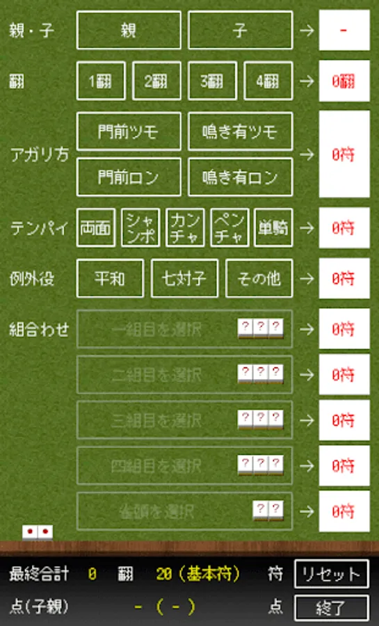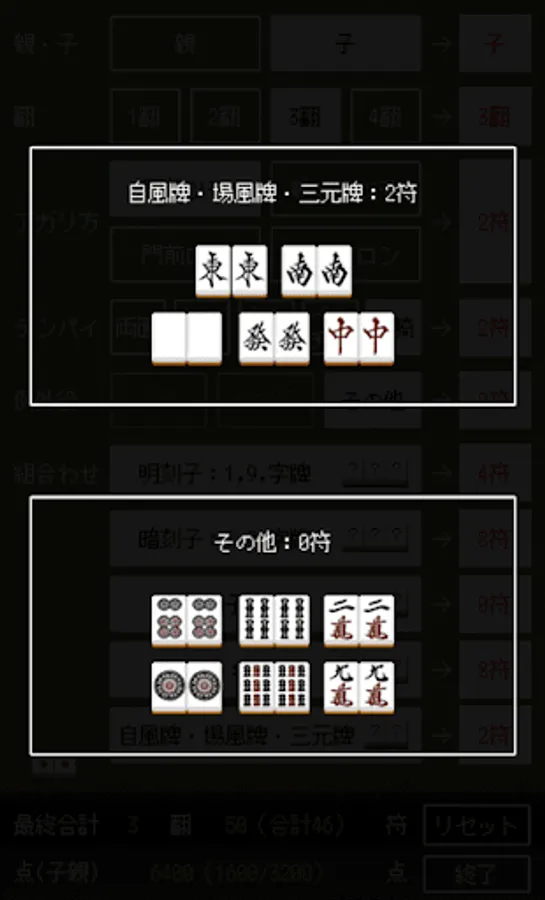 ・親と子、ツモとロン、アガリの形、翻、符、点数を1画面で全て見れるように配慮(面子選択のみ別画面)
