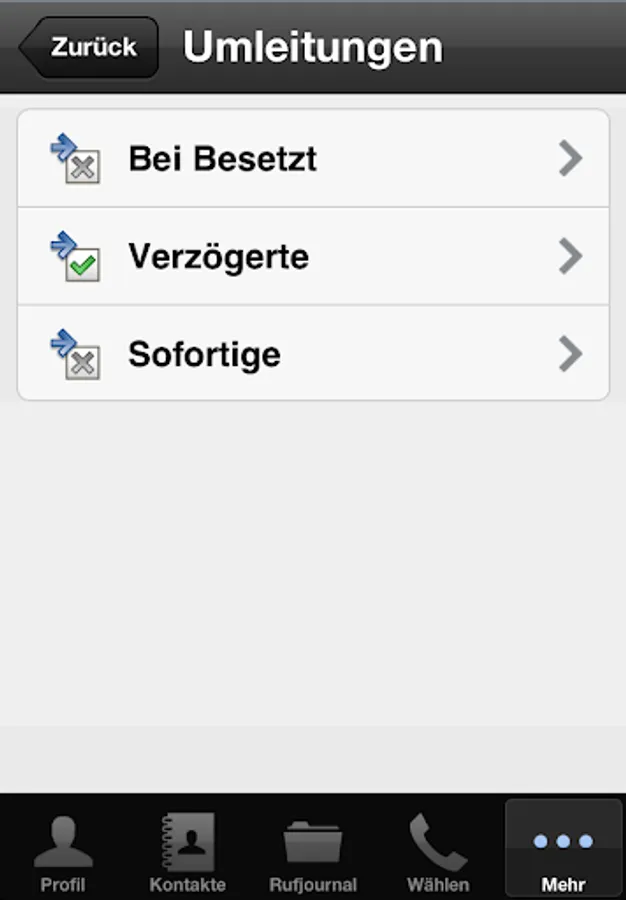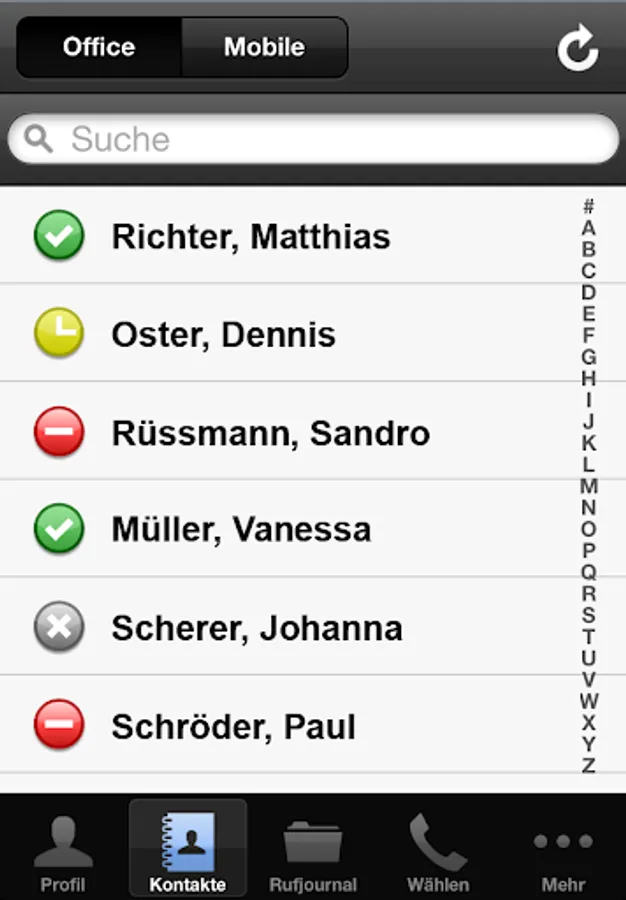 Within the global contacts in SwyxIt! Mobile, the current status ("Available ", "Logged off", "Speaking", "Away" or "Do not disturb") is shown for every SwyxWare user in your company. Since it is possible to present the global phonebooks of multiple SwyxServers in a unified form, cross-server status signaling is achieved.