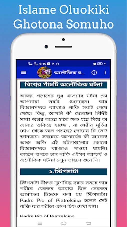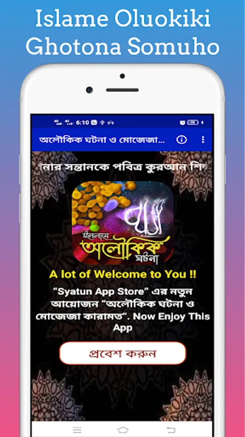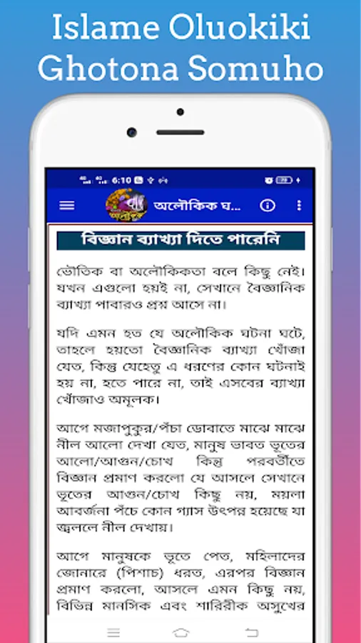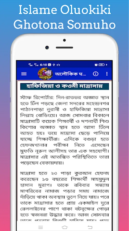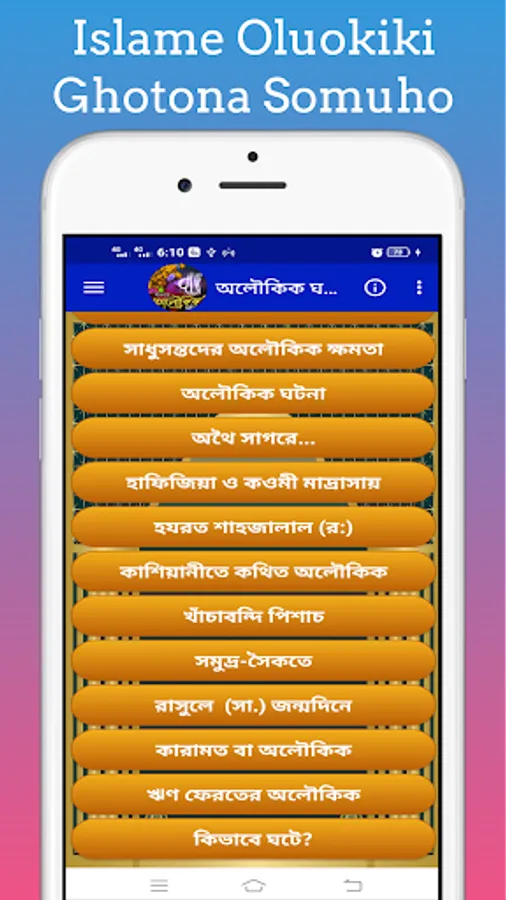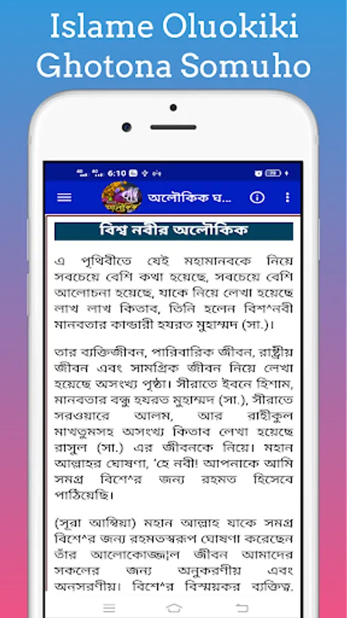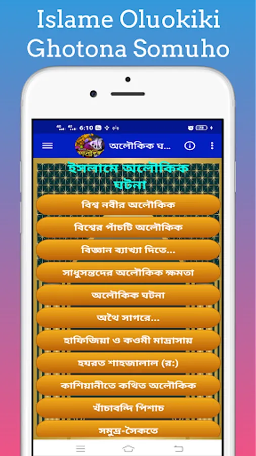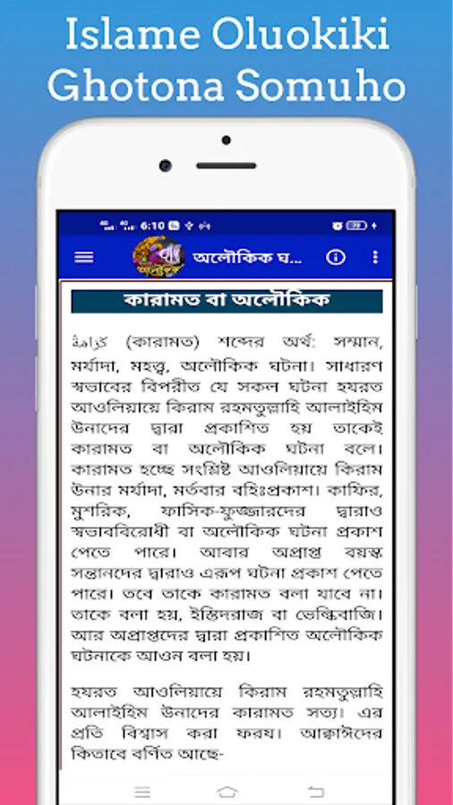 By this you can easily know about the miracles of the saints and the miracles of the life of the Prophet. Islamic Oloukik Ghotona With this app you can easily learn about the miracles of the Prophets and the different events of the Prophet.