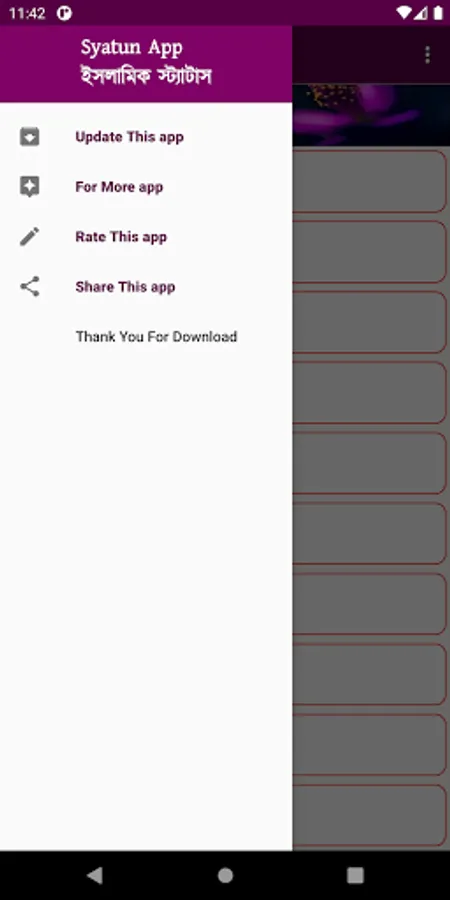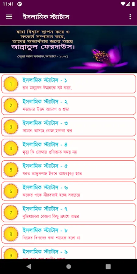 আ্যপটি ডাউনলোড করে দেখতে পারেন আশা করি আপনাদের অনেক ভালো লাগবে।অনেক সুন্দর একটি ইসালামিক স্ট্যাটাসের এ্যাপ, উপভোগ করতে এখনই ডাউনলোড করুন। অ্যাপটি যদি আপনাদের ভাল লাগে তাহলে শেয়ার ও রেটিং দিতে ভুলবেন না।(সকলকে ধন্যবাদ।)