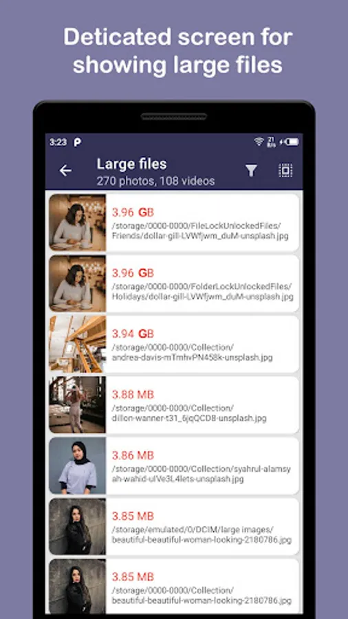 Large files - A dedicated screen for list your large size videos and photos, with the help of this screen user can easily find their biggest media files and remove for more memory space or whatever they want.