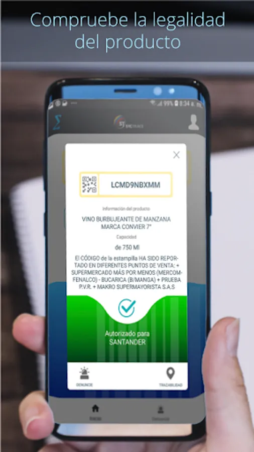 This system allows any person to trace or consult in an easy, fast, safe and free way, all the relevant information related to the acquired product, from the barcode, QR code or unique identification number located in the tricolor stamp, writing or by simply activating the camera of your mobile; Validated data such as: the characteristics of the product, the Department authorized for consumption, the distribution company, the origin and destination of the product. The user will be alerted to any irregularity in the information, making it possible to avoid consuming the product and providing the corresponding report.