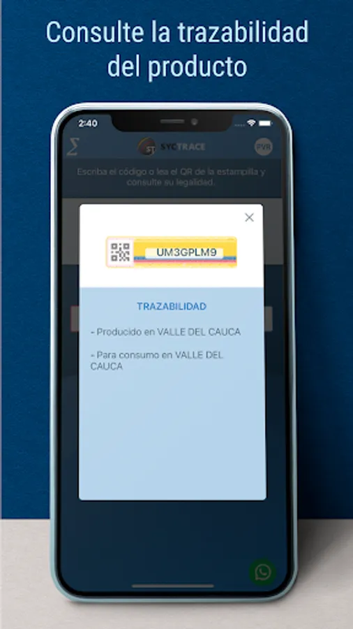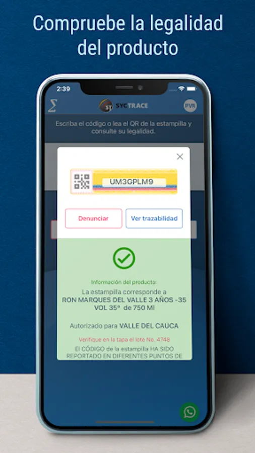 This system allows anyone to easily, quickly, safely and freely track or consult all the relevant information related to the purchased product, based on the barcode, QR code or unique identification number located on the tricolor stamp, by writing or simply by activating the camera of your mobile; Data such as: the characteristics of the product, the Department authorized for consumption, the distribution company, the origin and destination of the product are validated. The user will be alerted of any irregularity in the information, allowing them to avoid consuming the product and facilitating the respective complaint.