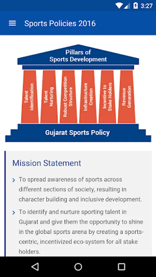 When the state of Gujarat State was established on 1st May, 1960, the Sports, Youth and Cultural Activities Department was not existing as an independent department, but to boost the youth activities in the state, it was formed as a separate department on 17/12/1990. Vide the new subjects reallocated to the department, the department has been renamed as Sports, Youth and Cultural Activities Department as per the General Administration Department (GAD) notification no. GS (97-26-SKT1197(3)KU) dated 5/8/1997, from original Youth Services and Cultural Activities Department. Accordingly, the department is now functioning under this name. This department carries out the activities related to sports, youth, cultural activities, museums, archaelogy, libraries, records and manuscripts, centenary celebrations, monuments and academies.