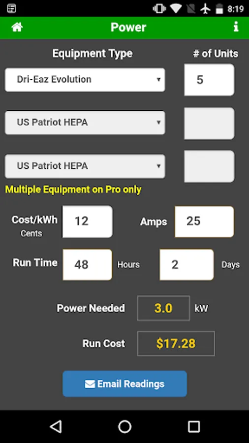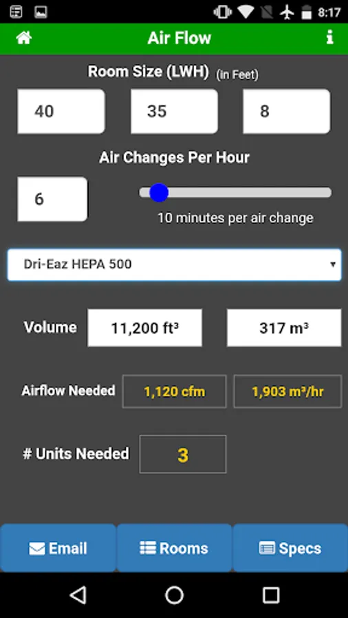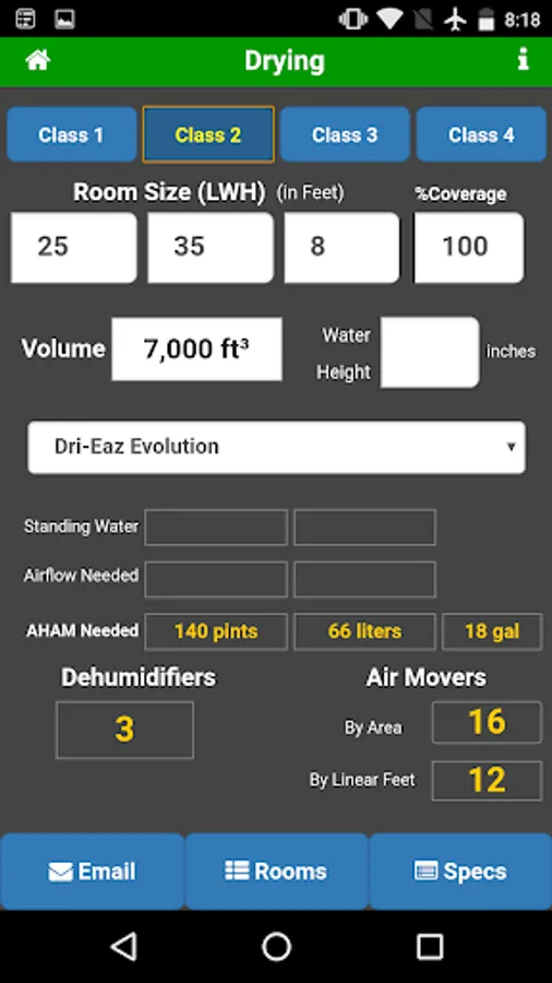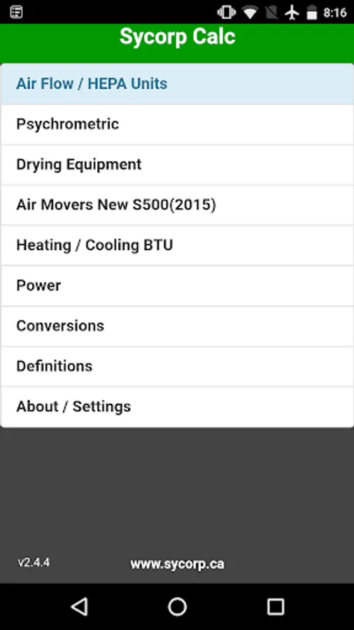 The Sycorp Calc app provides quick and easy access to a number of calculations used in Water Damage Restoration, Construction, HVAC and Indoor Air Quality industries. Easy to use, quick access for use on job sites. Great for water technicians, supervisors, and insurance adjusters. Based on IICRC formulas. Includes published specs on equipment from Dri-Eaz, Phoenix, Nikro, Jon Don, DryAir, B-Air, Abatement and others.