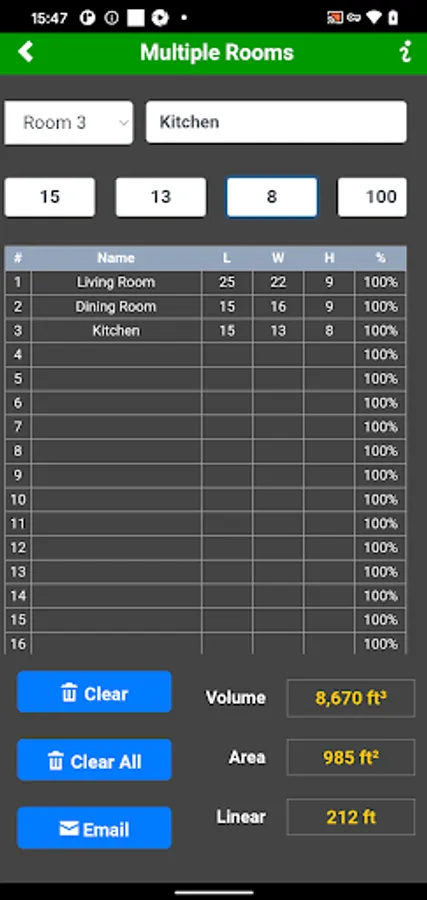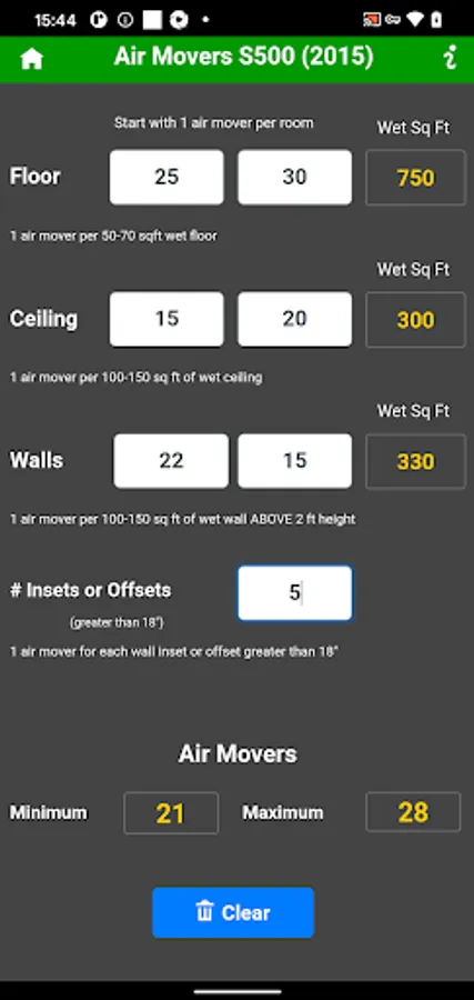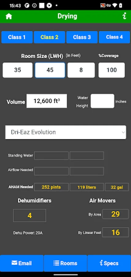 - Restoration: dehumidifiers and air movers needed on a job based on Class of Loss and size of area. Also how many gallons of water in a given area. Enter multiple rooms sizes