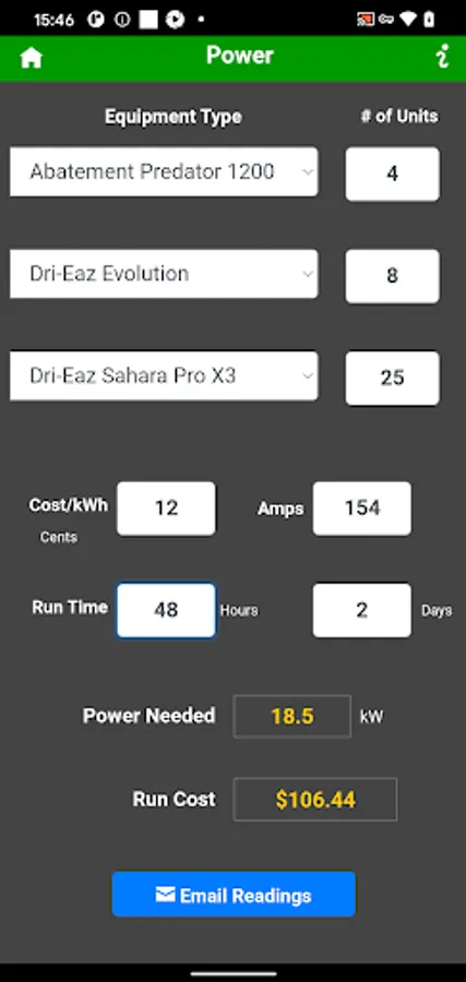 - Power: Select equipment and calculate how much power is needed, cost and runtime