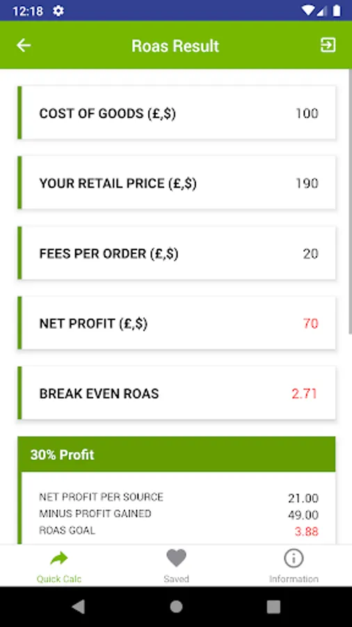 -Once you have entered information about your products and calculated your ROAS, you can save it in the app to come back to later
