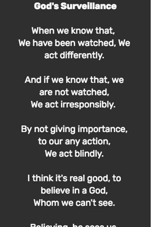 Syed Imon Rizvi has proven that one can write powerful poetry by using simple nuances and vocabulary that even a child can understand and be motivated with. Because mainly the power of truth itself gives immense energy to a person to even share it further; and distribute it among masses. This book will touch the heart of each and every individual, who will read it with the understanding that it has been written under the influence of cries and sighs of the oppressed and poor. The greatest trait of poet's writing is that he expresses himself without feeling any pressure from worldly or materialistic influences. He puts everyone in the field of accountability; whether one is the president of the most powerful country on earth or the poorest person of the weakest country of the world.