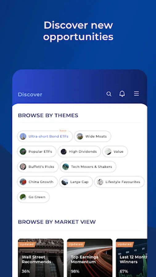 2. Thematic and Custom Portfolios: Express your beliefs as an investor. Capitalise on megatrends with ready-made themes or customise a portfolio from over 100+ curated ETFs to your liking with Custom.