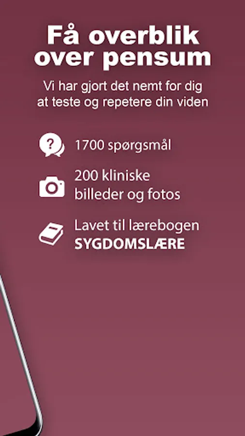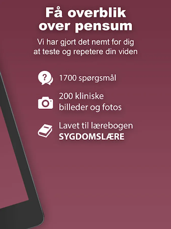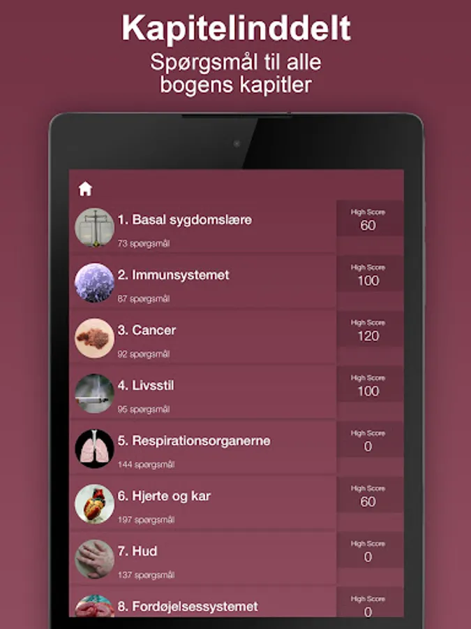 Categories and questions are based on the textbook Sygdomslæringen - hånden på hjertet 2. edition of Arne Lykke Viborg et al. For each quiz you can see a status of your answers to this particular quiz and you can dodge your friends and readers with the 1 to 1 feature. Note multiplayer 1 against 1 requires you to be signed in to Google Play.
