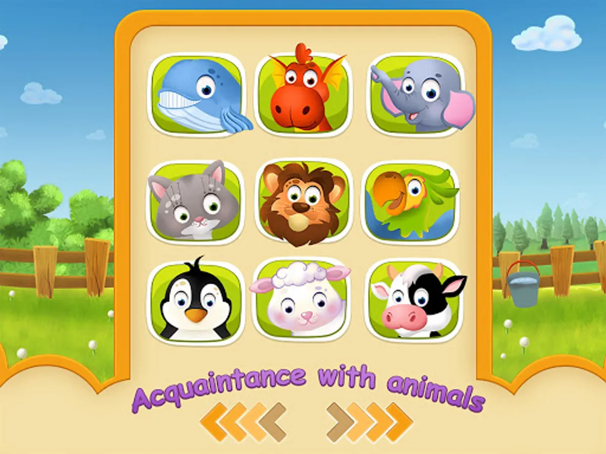 Learn the animals: whale, cow, sheep, elephant, penguin, dog, lion, parrot, cat, octopus, owl and even dragon. Children will learn to identify them during gameplay by pressing different buttons. In response, they will hear a puppy bark, a cow moo, a kitten meow, a sheep bleating, a lion cub roar and other animals “communicating” with them through the phone.