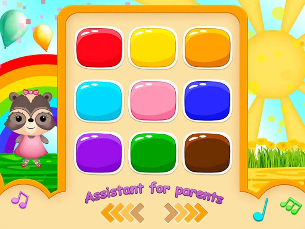 Learn the colors. Candy the Raccoon will help your child discover different colors: red and yellow, orange and green, cyan and blue, violet, pink and brown. Candy the Raccoon, being a little fashionista she is, will change her outfit according to each color. The kids will also visit the motley rainbow world for a fun musical air-balloon bursting adventure!