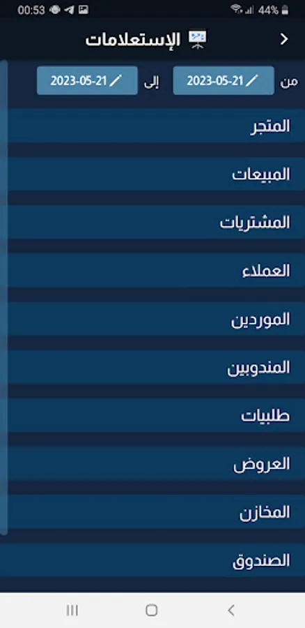( المشتريات - المبيعات - العملاء - المنذوبين- الموردين -المصروفات -الصندوق- العروض- الطلبيات -الاستعلامات- المرسلات ..... ) ،