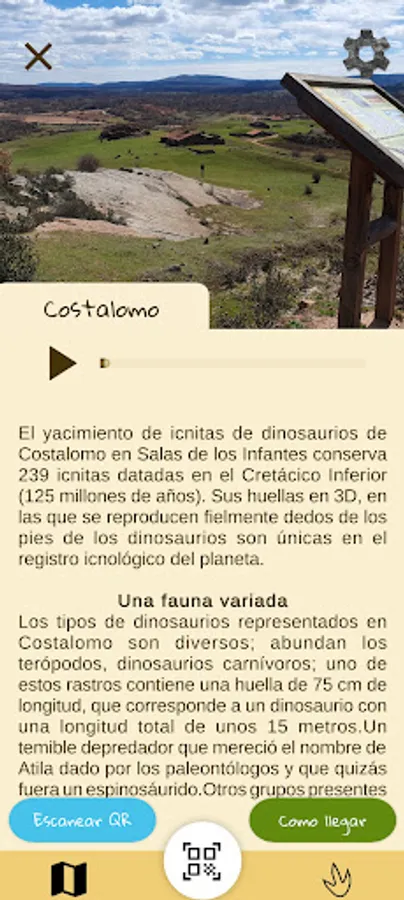 Educational application, with the purpose that users get to know the area of Valle del Arlanza and can approach the world of paleontology, footprints and fossil remains in a pleasant way that make this place an important Asset of Cultural Interest. You will learn by playing about the dinosaurs found in the area.