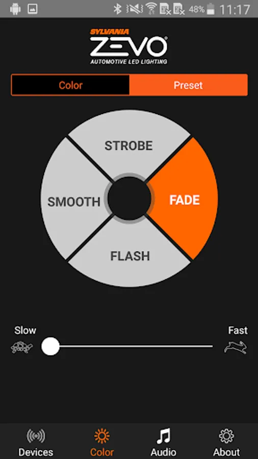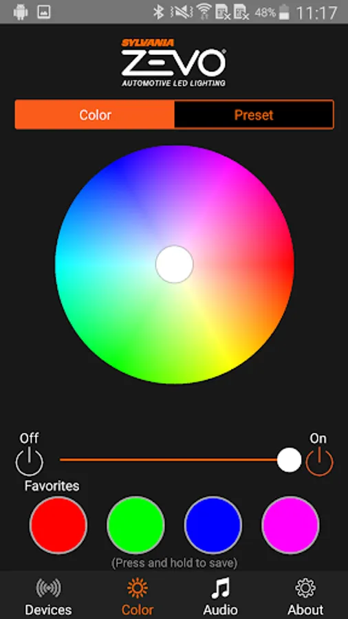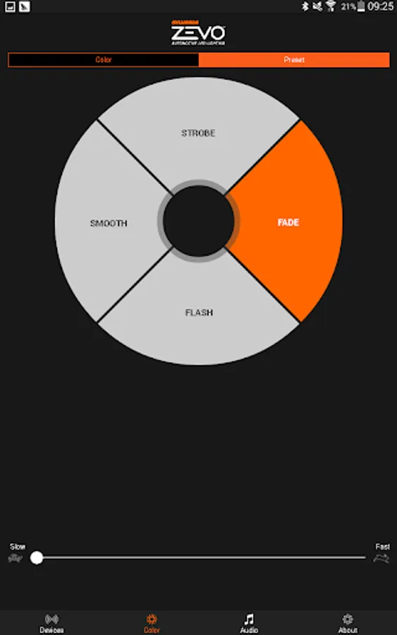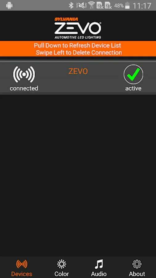 Simple one screen app allows for quick access to color adjustments of the ZEVO Pulse or Hybrid devices. App's main page contains a pull down menu to connect to the ZEVO device. Once connected, user can quickly and easily configure their car's accent lighting via Bluetooth.