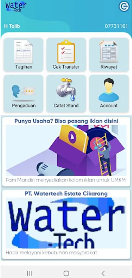 PAM Watertech billing information application, payment by transfer, complaint of PAM disturbance, upload stand meter independently