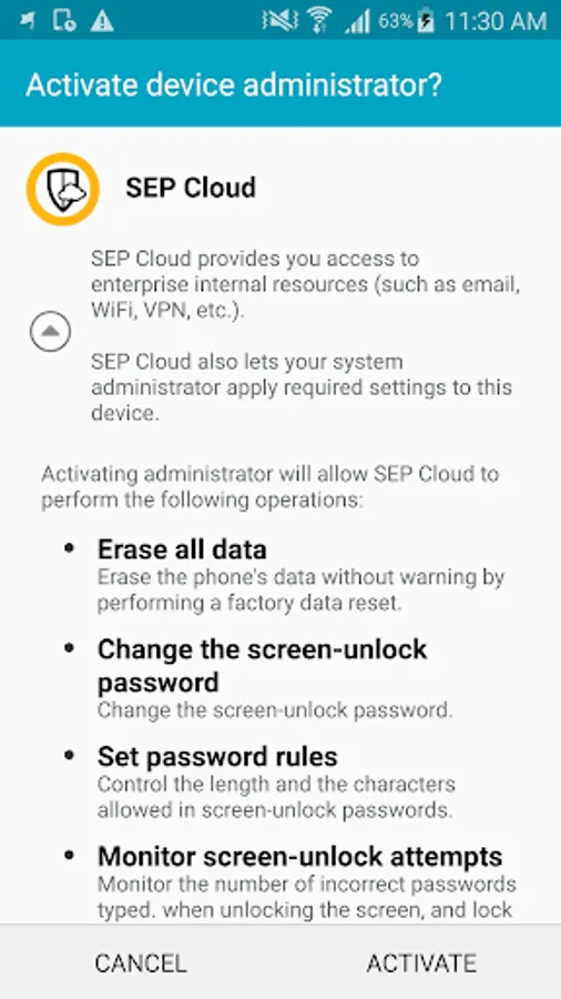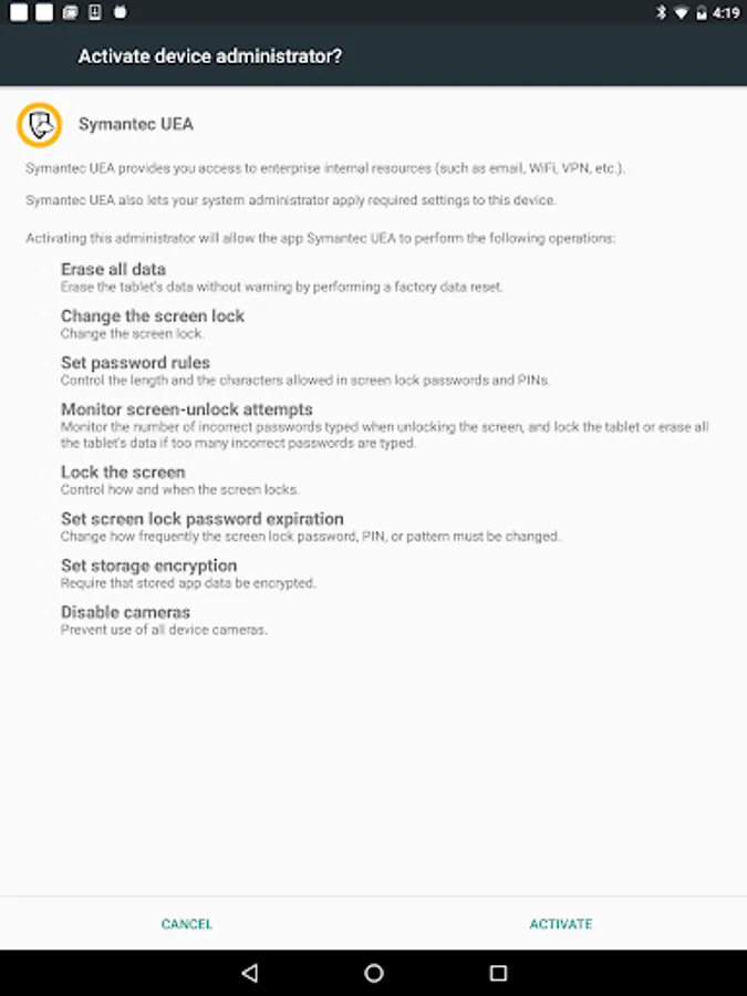 ymantec Endpoint Protection Cloud™ provides you access to enterprise internal resources (such as email, WiFi, VPN, etc.) which require the activation of the device administrator privilege. This privilege can allow an administrator to remotely wipe or lock your device. This application also uses Accessibility services.