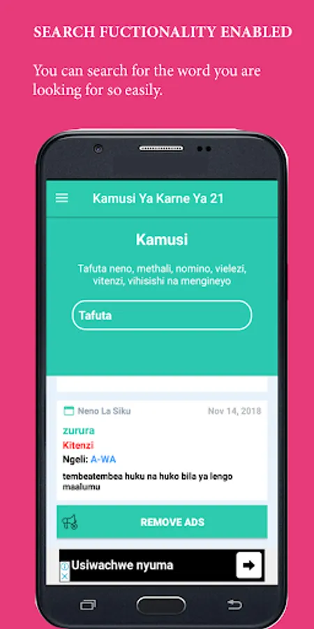 Kamusi Ya Karne Ya 21 android app is a digital Swahili dictionary of Longhorn Publishers Limited. The product is suitable for use by primary school pupils, secondary school students, university students, Kiswahili teachers and lecturers, Kiswahili experts, researchers and all Kiswahili speakers in the world. The app is also recommended for Swahili learners across the globe.