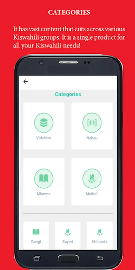 The product has been integrated with interactive materials, hyperlinks among many other features. Groups such as Misemo (sayings), Nahau (idioms) and Methali (proverbs) have been segregated and placed independently to ensure the user utilizes the app efficiently and effectively.