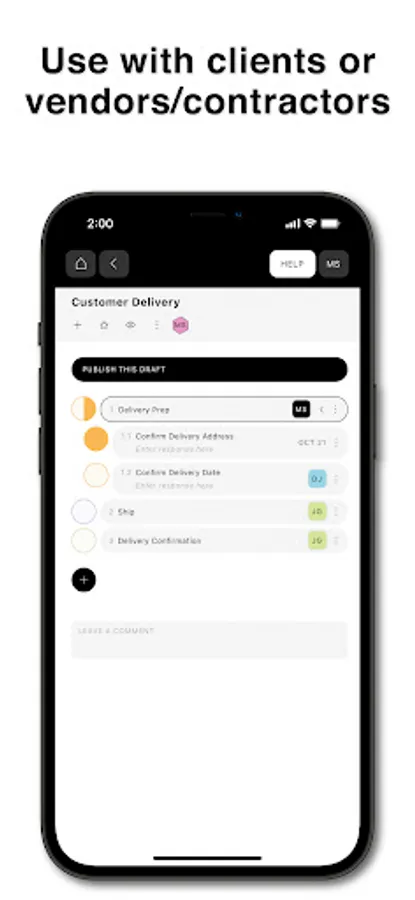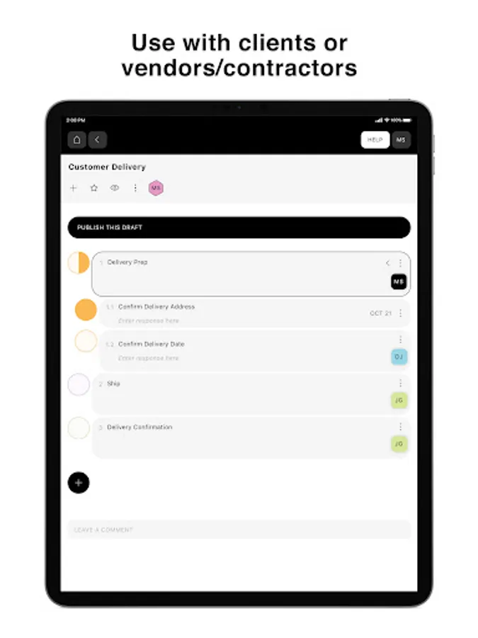 Share tasks with anyone, whether they have the app or not. This makes it great for things like guiding a potential client through a process of deciding to work with you, or coordinating a project with an outside consultant.